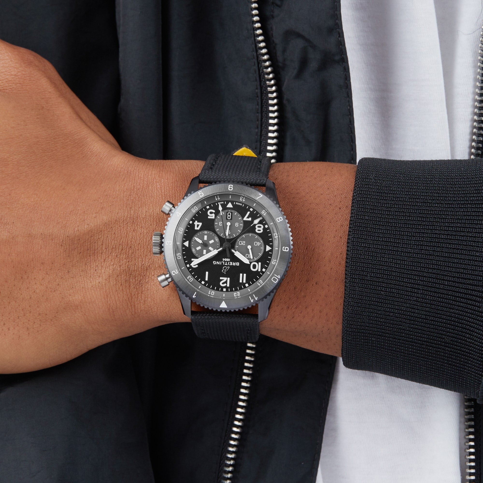Super AVI - Breitling's tribute to legendary aircraft Inspired by the spirit of early aircraft and the design of the de Havilland Mosquito Designed to withstand the rigors of a vintage cockpit Black dial framed by a knurled bezel Powered by the B04 calibre GMT Chronograph movement with 70 hours of power reserve AVIATION HERITAGE Super AVI, the newest watch series from Breitling, is a celebration of aviation history with designs inspired by four legendary aircraft. This Mosquito model draws its design inspiration from the de Havilland Mosquito, which was crafted from wood in a bid to overcome aluminium and steel shortages. Known as the Wooden Wonder, the aircraft outperformed its metal contemporaries to become one of the fastest planes built between 1940 and 1950. A true pilot's watch, the Mosquito timepiece offers optimal grip for operation by gloved hands, sizeable numerals that can be spotted with ease, and an additional hand indicating a second time zone. THE DARKEST NIGHT SKIES Inspired by the Night Fighter 2, an all-black two-seater aircraft designed to slip stealthily through the night sky, this 46mm Mosquito Night Fighter model is presented in a black ceramic case with titanium pushers, crown, and case back creating a striking contrast. Framed by a knurled bezel, the black dial presents silver-tone hands, highly legible Arabic numerals, a date display, and three sub-dials. Pilots and other travellers will appreciate the ability to track a second time zone using the 24-hour marking on the inner bezel and the white-tipped GMT hand. The Breitling B04 calibre GMT movement provides power and precision to this exceptional timepiece, while a black military leather strap completes the look, providing a nod to classic flight gear.