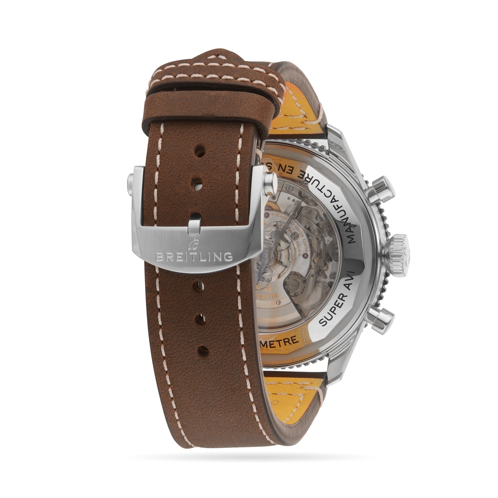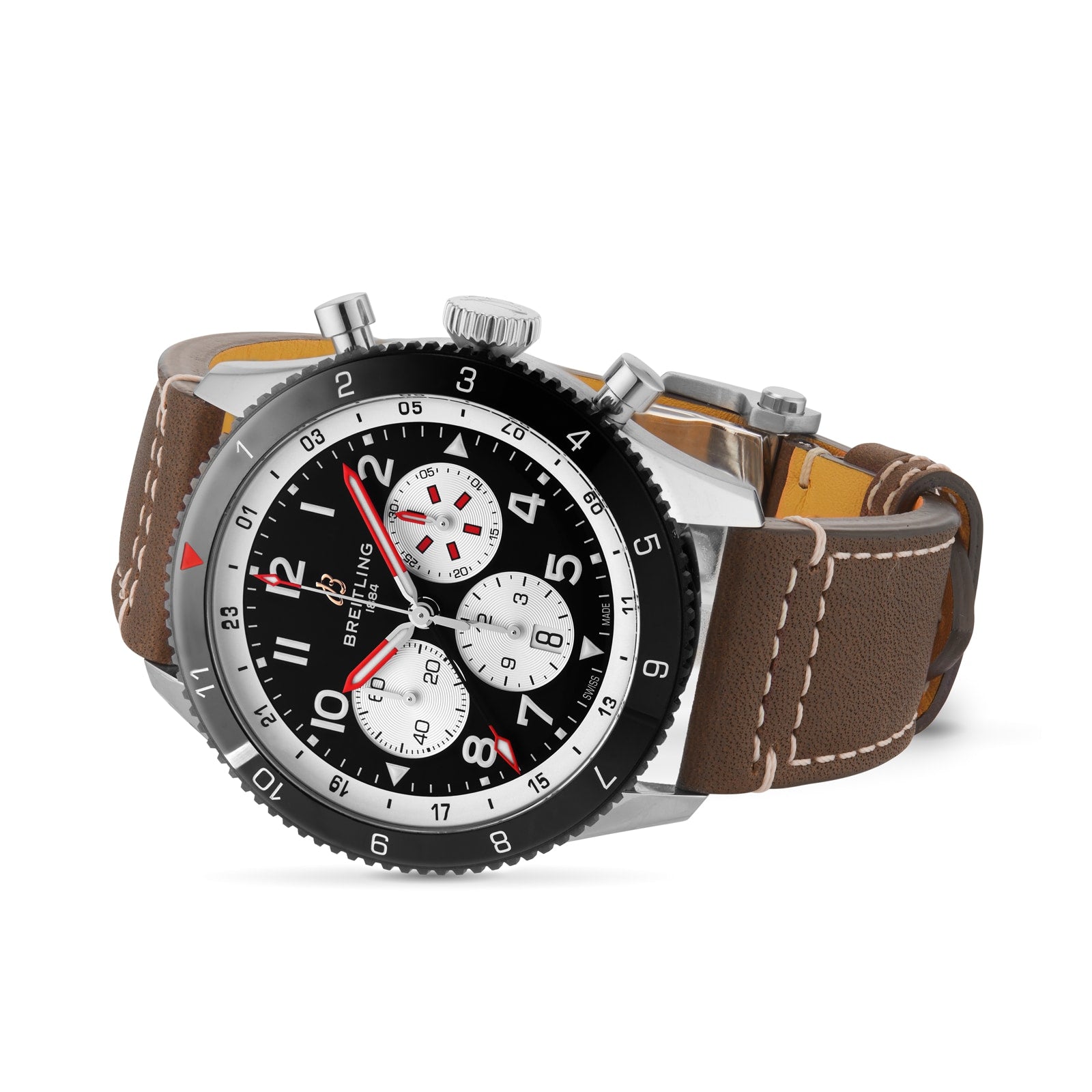 Super Avi - Breitling's tribute to legendary aircraft Inspired by the spirit of early aircraft and the design of the de Havilland Mosquito Designed to withstand the rigors of a vintage cockpit Black dial framed by a knurled bezel B04 calibre GMT Chronograph movement with 70hrs of power reserve and 10 bar (100 metres) water resistance AVIATION HERITAGE Super Avi, the newest watch series from Breitling, is a celebration of aviation history with designs inspired by four legendary aircraft. This Mosquito model draws its design inspiration from the de Havilland Mosquito, which was crafted from wood in a bid to overcome aluminium and steel shortages. Known as the Wooden Wonder, the aircraft outperformed its metal contemporaries to become one of the fastest planes built between 1940 and 1950. A true pilot's watch, the Mosquito timepiece offers optimal grip for operation by gloved hands, sizeable numerals that can be spotted with ease, and an additional hand indicating a second time zone. A WATCH FOR ADVENTURERS A chronometer certified by the COSC, this 46mm stainless steel model is presented on a brown leather strap with white topstitching to honour the seams found on classic flight gear. Framed by a knurled bezel, the black dial presents silver-tone hands, highly legible Arabic numerals, a date display, and three sub-dials. Pilots and other travellers will appreciate the ability to track a second time zone using the 24-hour marking on the inner bezel and the red tipped GMT hand. The Breitling B04 calibre movement provides power and precision to this exceptional timepiece.