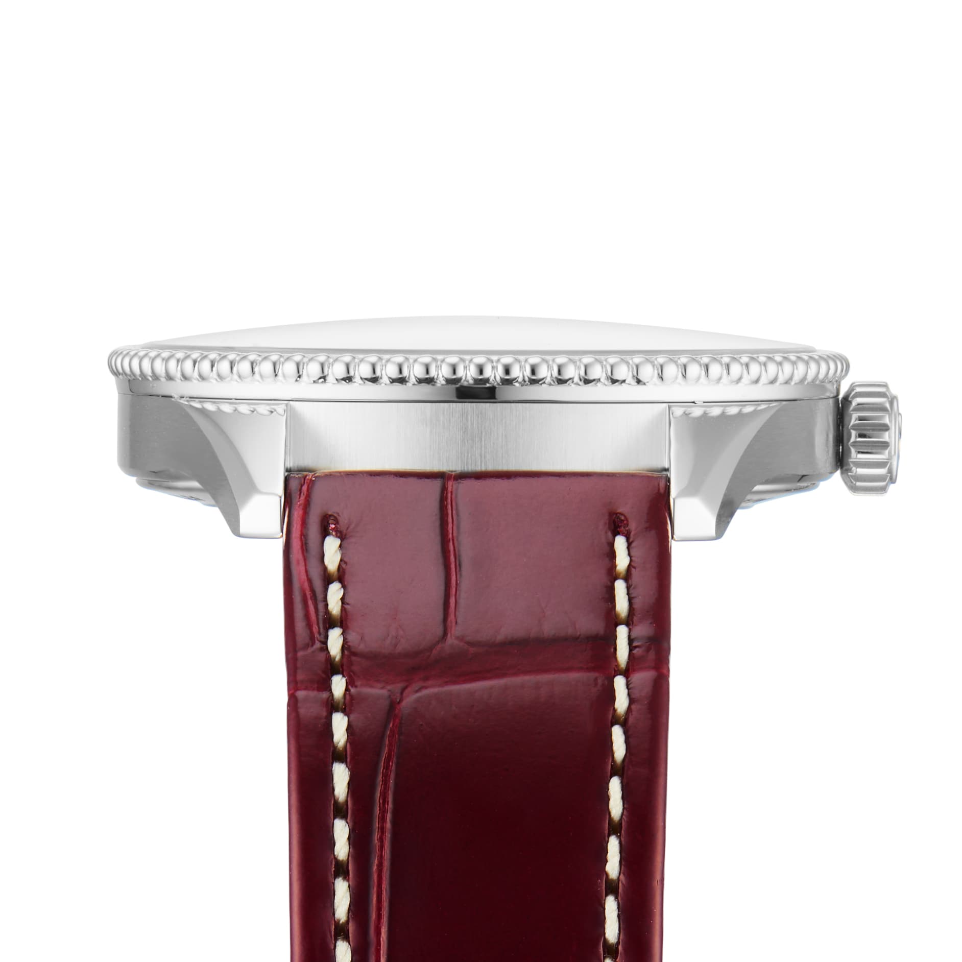 Navitimer - from flight tool to icon Introducing a watchmaking legend to a whole new generation Beautifully housed in a 32mm stainless steel case with a bold burgundy alligator leather strap Diamond-set white mother-of-pearl dial framed by a distinct beaded bezel Powered with precision by the Breitling Calibre 77 Thermocompensated SuperQuartz™ movement A TIMELESS STATEMENT OF BEAUTY For 70 years, the Navitimer has been one of the most beloved mechanical chronographs in the world. Refined and elegant, the Navitimer 32mm brings together the historic appeal of a true icon with the sophistication of a contemporary timepiece, introducing the watchmaking legend to a whole new generation. Pops of pastel, mother-of-pearl, and precious materials sit alongside subtle refinements to give a jewellery-like appeal and versatile elegance. BOLD AND RADIANT Contrasting bold burgundy and ethereal mother- of-pearl, this eye-catching timepiece is housed in a 32mm stainless steel case and secured with a burgundy alligator leather strap. Framed by a distinct, stainless steel beaded bezel, the ethereal white mother-of-pearl dial reflects the light from every angle and is further elevated by 12 glistening diamond-set hour markers and a red-tipped, red gold seconds hand. Driven by the Breitling Calibre 77 Thermocompensated SuperQuartz™ movement, this striking model is water resistant to 5 bar (50 metres).
