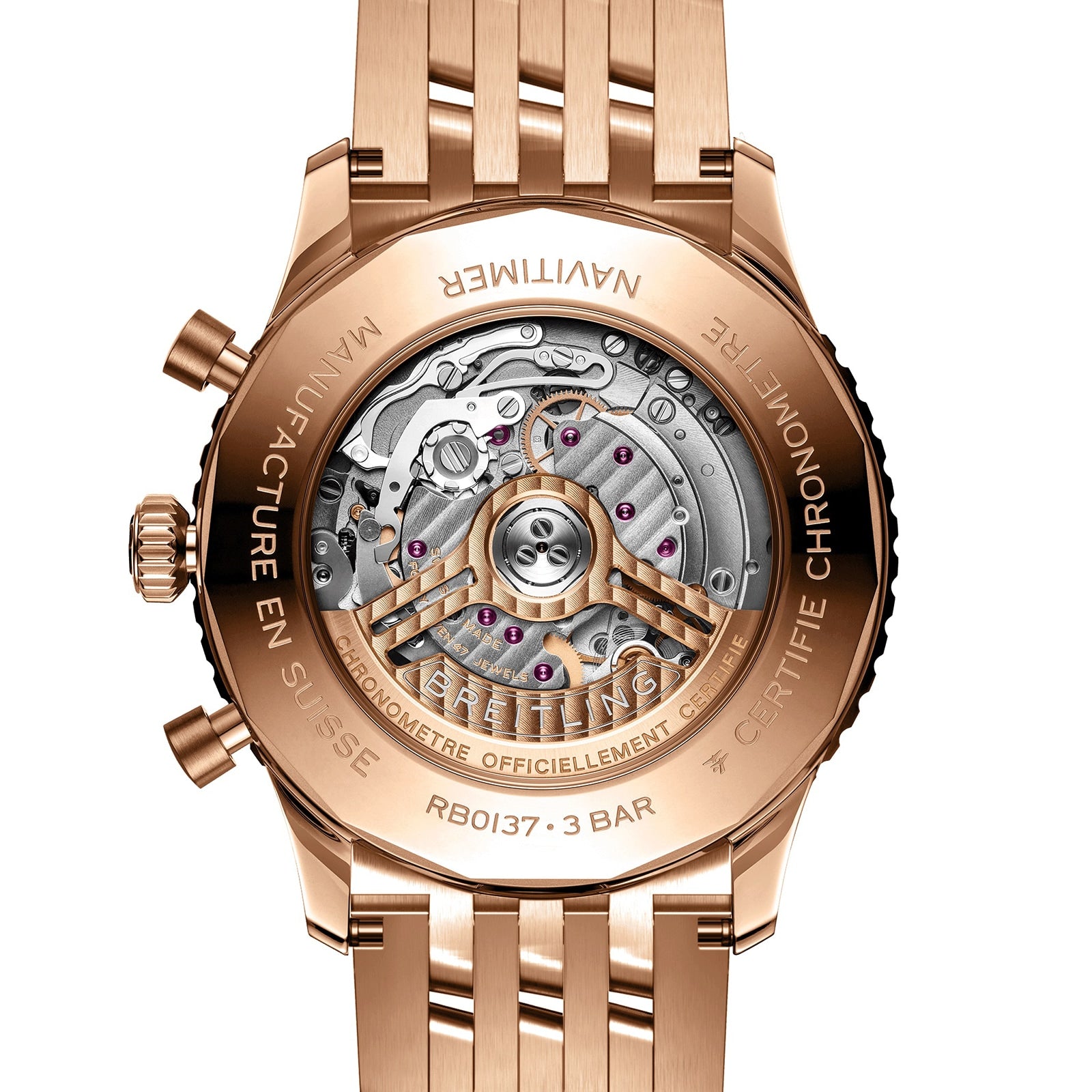 Navitimer - worn by airline captains and aircraft enthusiasts alike for more than 70 years Classic features enhanced with modern refinements Presented in a 46mm 18K red gold case paired with a black alligator leather strap Driven by the Breitling 01 self- winding mechanical movement One of the most recognisable watches of all time BREITLING'S MOST ICONIC TIMEPIECE First introduced in 1952, the navigation timer or Navitimer, was designed to allow pilots to perform all necessary flight calculations in the sky. Two years later, it was named the official timepiece of the Aircraft Owners and Pilots Association - the largest pilot's club in the world. Staying true to the iconic collection, this new Navitimer B01 Chronograph presents classic features enhanced with modern refinements, namely a sleeker profile, as well as brushed and polished metal elements for a luxe yet somehow understated finish. A nostalgic nod to the original design, the model features the AOPA wings at the original position of 12 o'clock. AN IRREPRESSIBLE AESTHETIC One of the most recognisable watches of all time, this impressive model pairs a 46mm 18K red gold case with a bidirectional, slide rule bezel, and an 18K red gold bracelet. The lustrous green dial offers chronograph functionality with a 1/4th second chronograph, 30-minute and 12-hour totalizers, as well as a red seconds hand. This timepiece is powered by the in- house Breitling 01 calibre movement, a COSC-certified chronometer, is water resistant to 30 bar (300 metres), and features a 70- hour power reserve. An irrepressible aesthetic loved by aviators and tastemakers in equal measure.