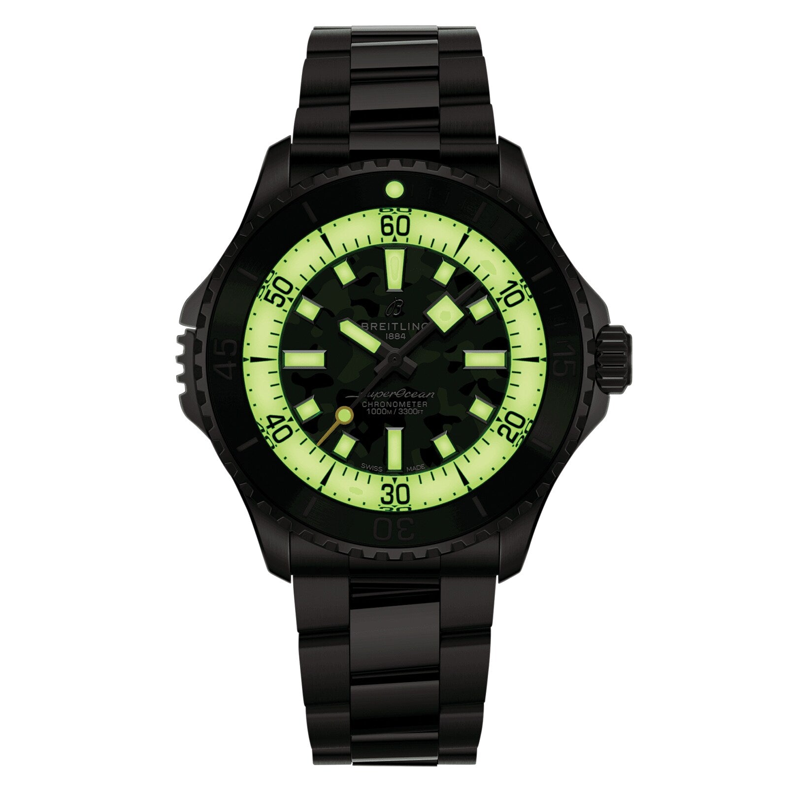 Super Diver - inspired by the original Superocean from the 1950s Retracing the Slow Motion's celebrated design codes Housed in a 46mm titanium case secured with a titanium bracelet Powered with precision by the Breitling 10 calibre movement Water resistant to 100 bar (1000 metres) A FRESH NEW LOOK Inspired by the original Superocean from the 1950s, the Superocean Heritage collection brings together a whole host of iconic design features to deliver the ultimate sea watch. Designed to perform on land and beneath the waves, the Superocean Automatic Super Diver retraces the Slow Motion's celebrated design codes, adding modern features such as a scratch-proof matt ceramic-inlayed bezel and camouflage dials. EQUIPPED FOR THE DEPTHS Bold and uncompromising, this striking model is housed in a 46mm titanium case secured with a matching bracelet, with a folding clasp that allows for micro-adjustments of up to 15mm for easy wear over wetsuits and rashies. The green cameo dial introduces a touch of modern styling to this iconic model, with bold white indexes and a yellow-tipped seconds hand. Powered by the Breitling 10 calibre movement, this performance-focused timepiece is water resistant to 100 bar (1000 metres) and has a 42-hour power reserve.
