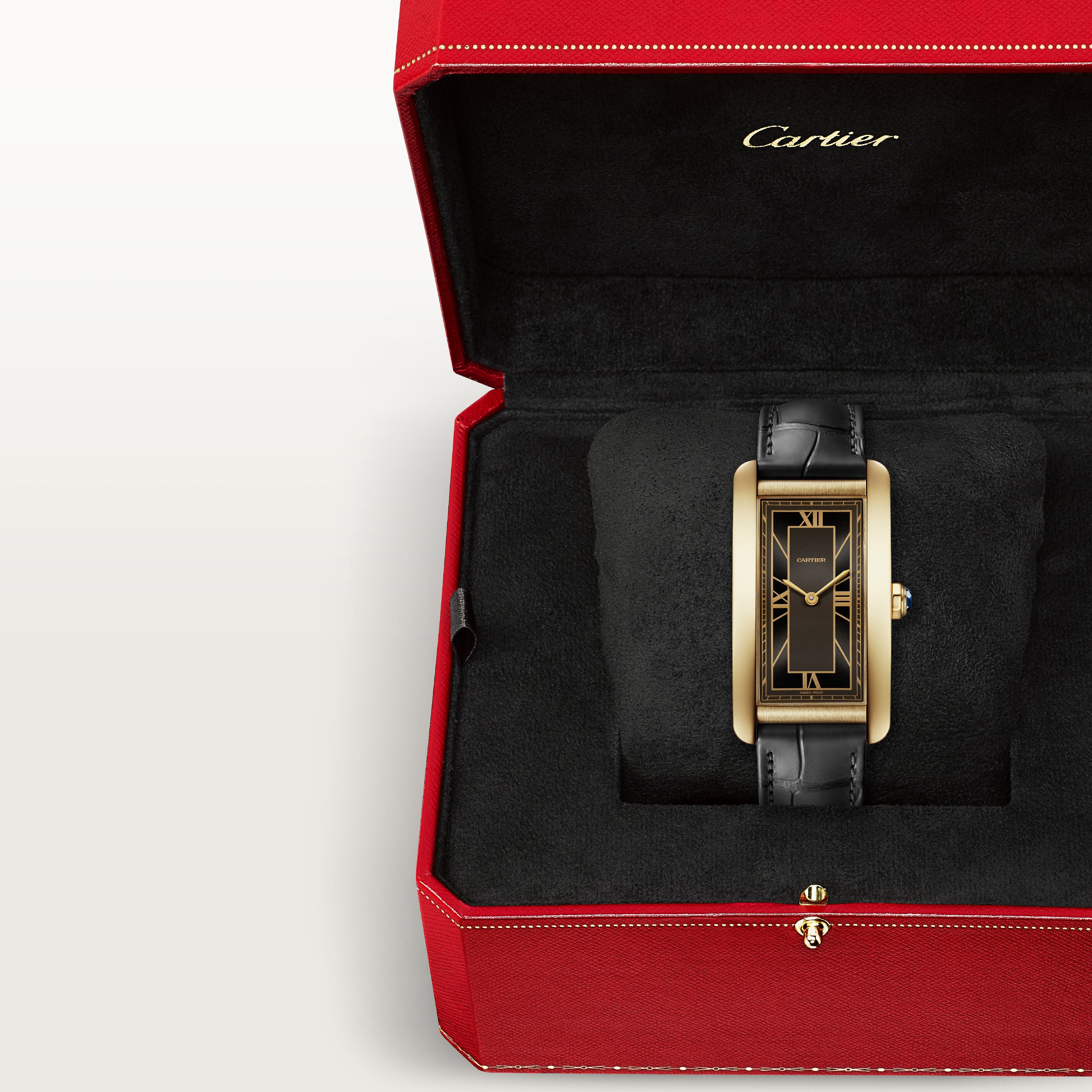 The Tank Américaine watch boasts a large model and mechanical movement with automatic winding. Its impressive yellow gold 750/1000 case is complemented by a stunning faceted sapphire on the crown. The anthracite dial features exquisite art deco animation and is accentuated by gold-finish steel sword-shaped hands. The sapphire crystal adds a touch of elegance. With a semi-matte grey alligator leather strap and interchangeable yellow gold 750/1000 folding buckle, this watch exudes luxury. It has a case dimensions of 44.4 mm x 24.4 mm and a slim thickness of 8.6 mm. Additionally, it is water-resistant up to 3 bar (approx. 30 meters).