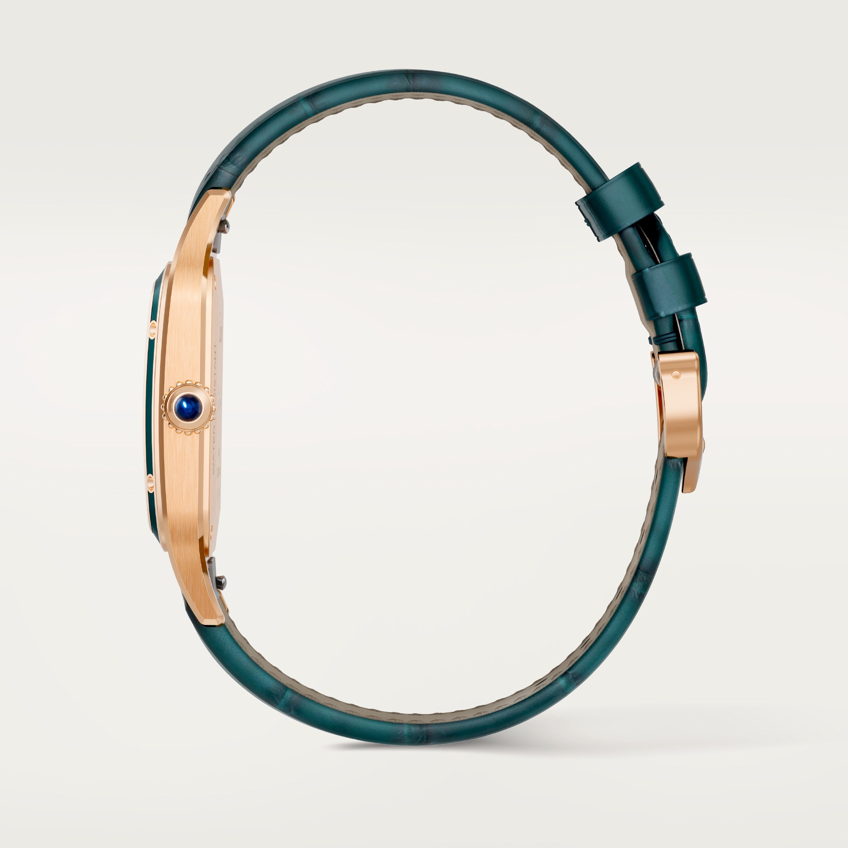 Indulge in the Santos-Dumont watch, featuring a grand mechanical movement with manual winding 430 MC. The 750/1000 rose gold case is adorned with a captivating blue cabochon-shaped sapphire on the beaded crown, while the sunray-brushed and lacquered peacock blue dial boasts elegant Arabic numerals and gold-finish polished steel sword-shaped hands. The case back proudly displays the handwritten signature of Alberto Santos-Dumont. The charming blue alligator leather strap is secured with a 750/1000 rose gold ardillon buckle. At a perfect size of 43.5 mm x 31.4 mm and a thickness of only 7.3 mm, this timepiece is water-resistant up to 3 bar (appr ox. 30 meters).