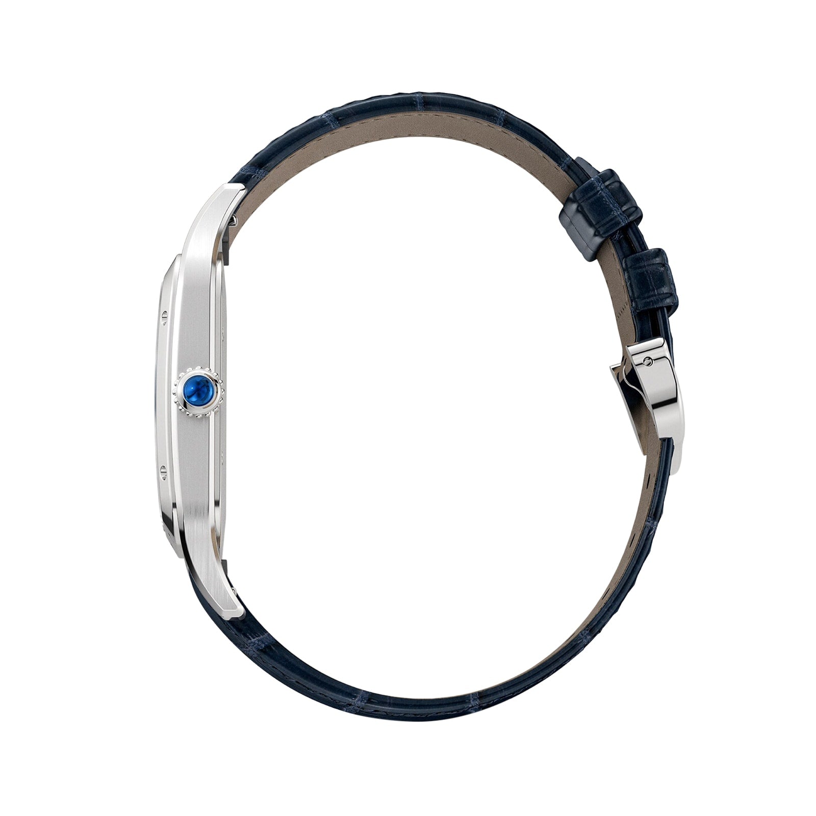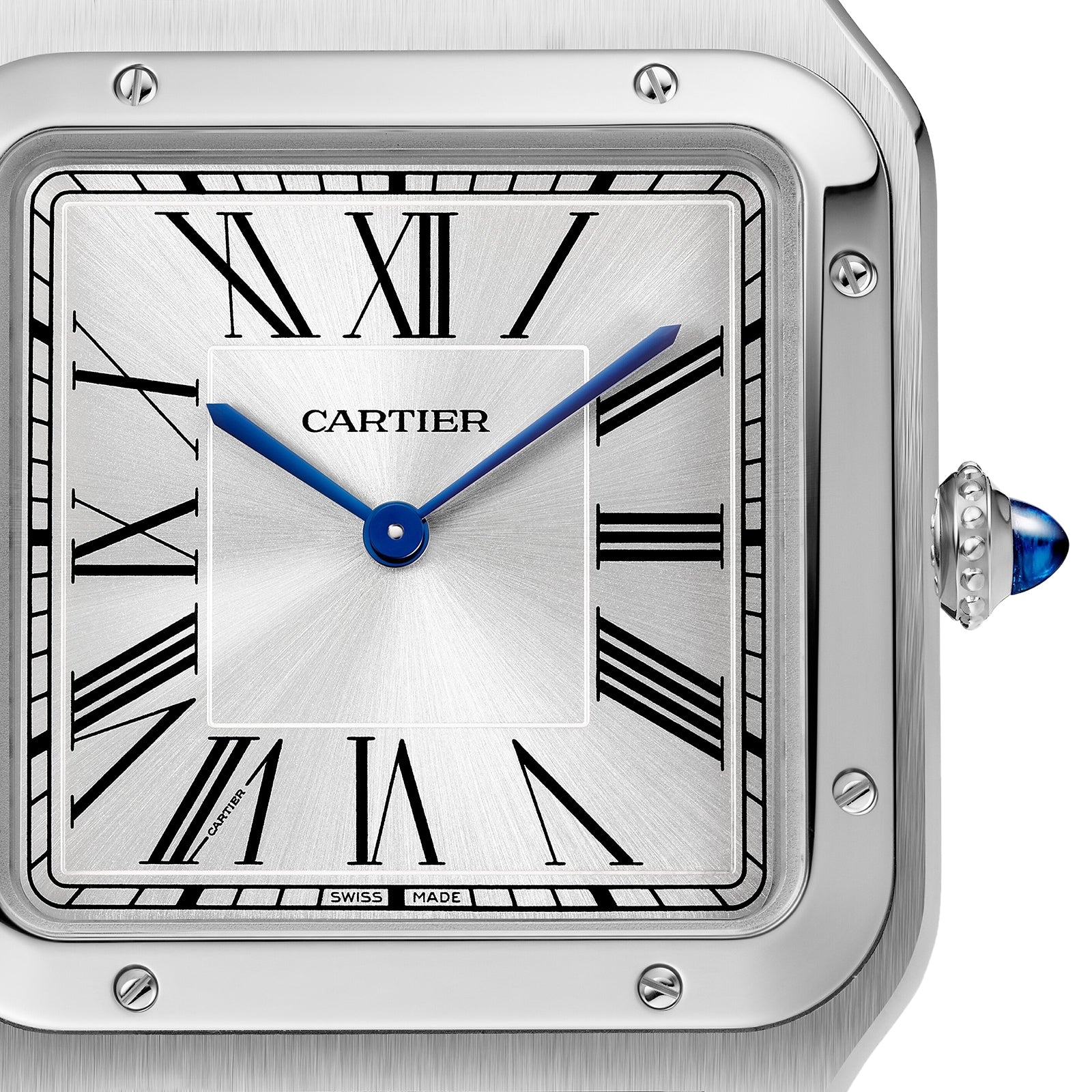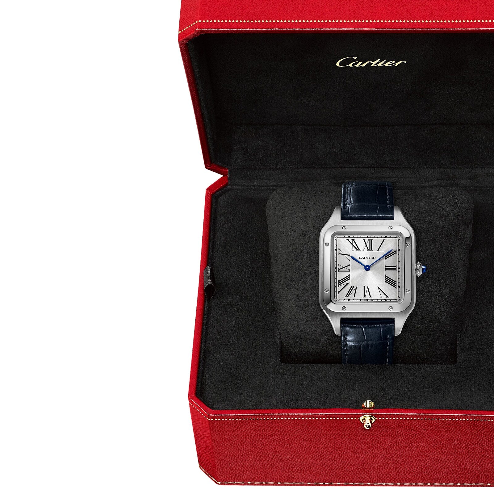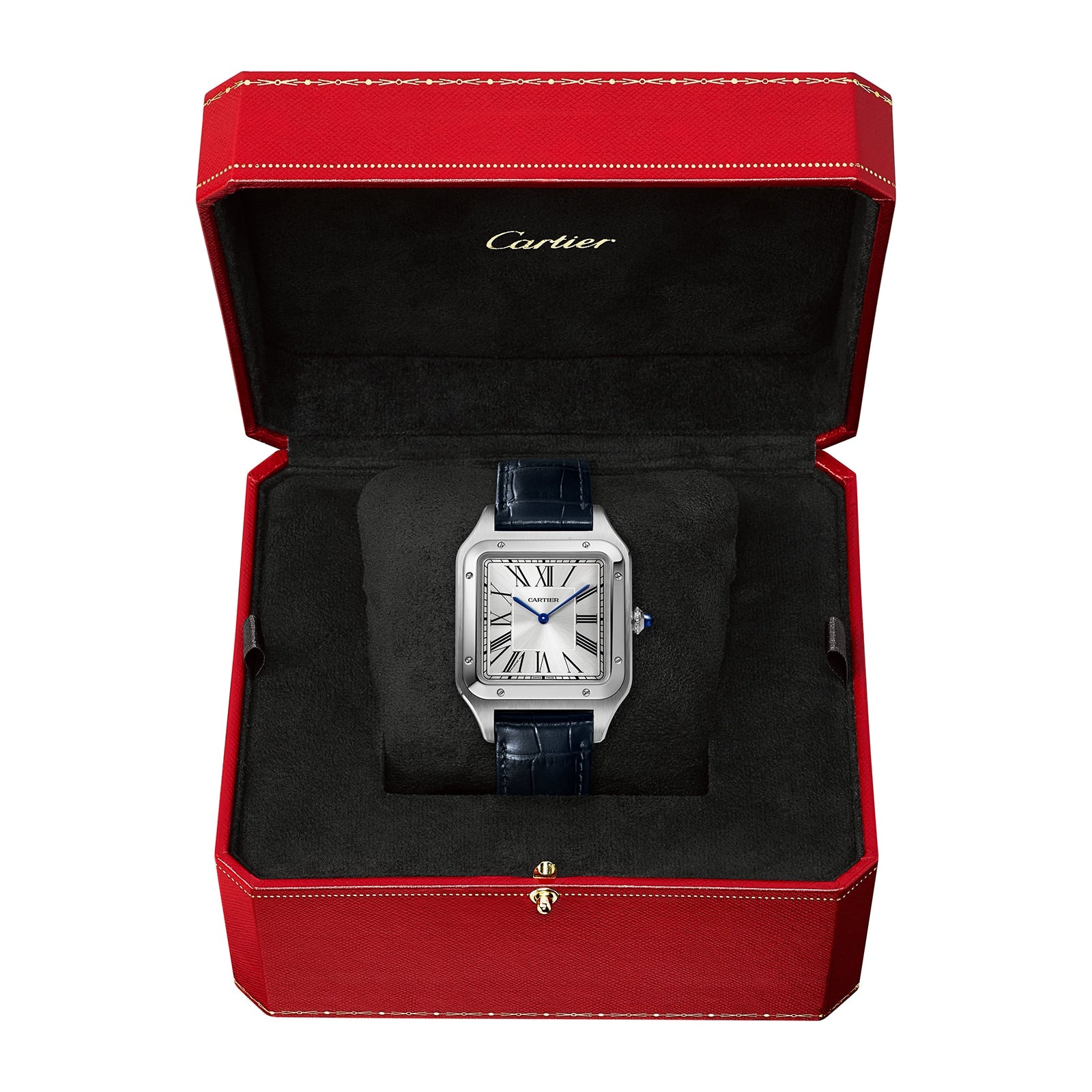 Santos-Dumont watch, extra-large model, Manufacture mechanical movement with manual winding, caliber 430 MC. Steel case, beaded steel crown set with a blue cabochon synthetic spinel, silver satin-finish dial with sunray-effect, Roman numerals, blued-steel sword-shaped hands, sapphire crystal. Navy blue alligator leather strap, steel ardillon buckle. Case dimensions: 46.6 mm x 33.9 mm, thickness: 7.5 mm. Water-resistant up to 3 bar (approx. 30 meters/100 feet). 1904. Louis Cartier granted the wish of his friend, the famous Brazilian aviator Alberto Santos Dumont: to be able to tell the time while flying. This was the birth of one of the first ever wristwatches. Featuring a geometric shape and exposed screws, the watch quickly became one of the Maison's watchmaking icons. The Santos rose to the ranks of a classic that would defy the hands of time. Explore the full Cartier range here.