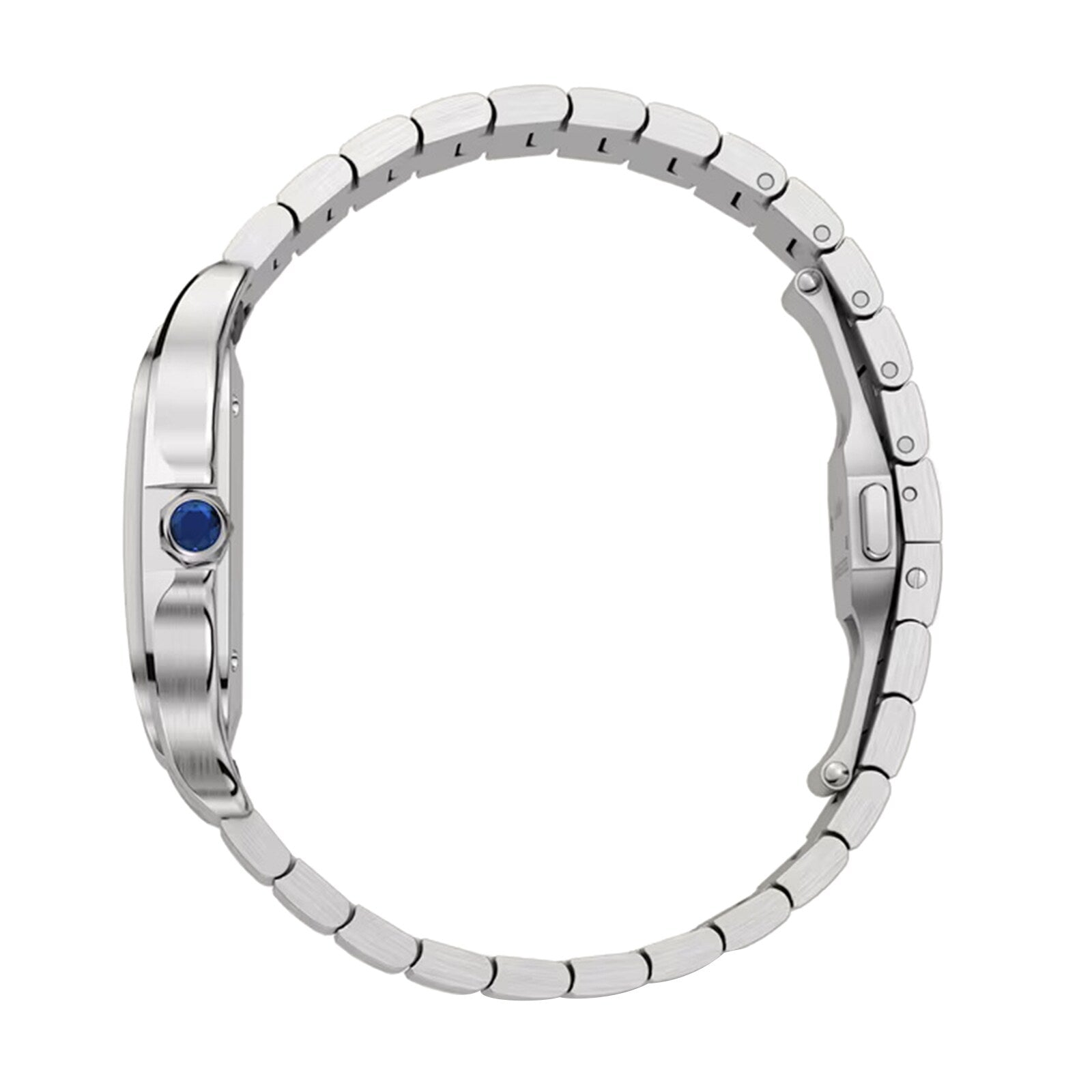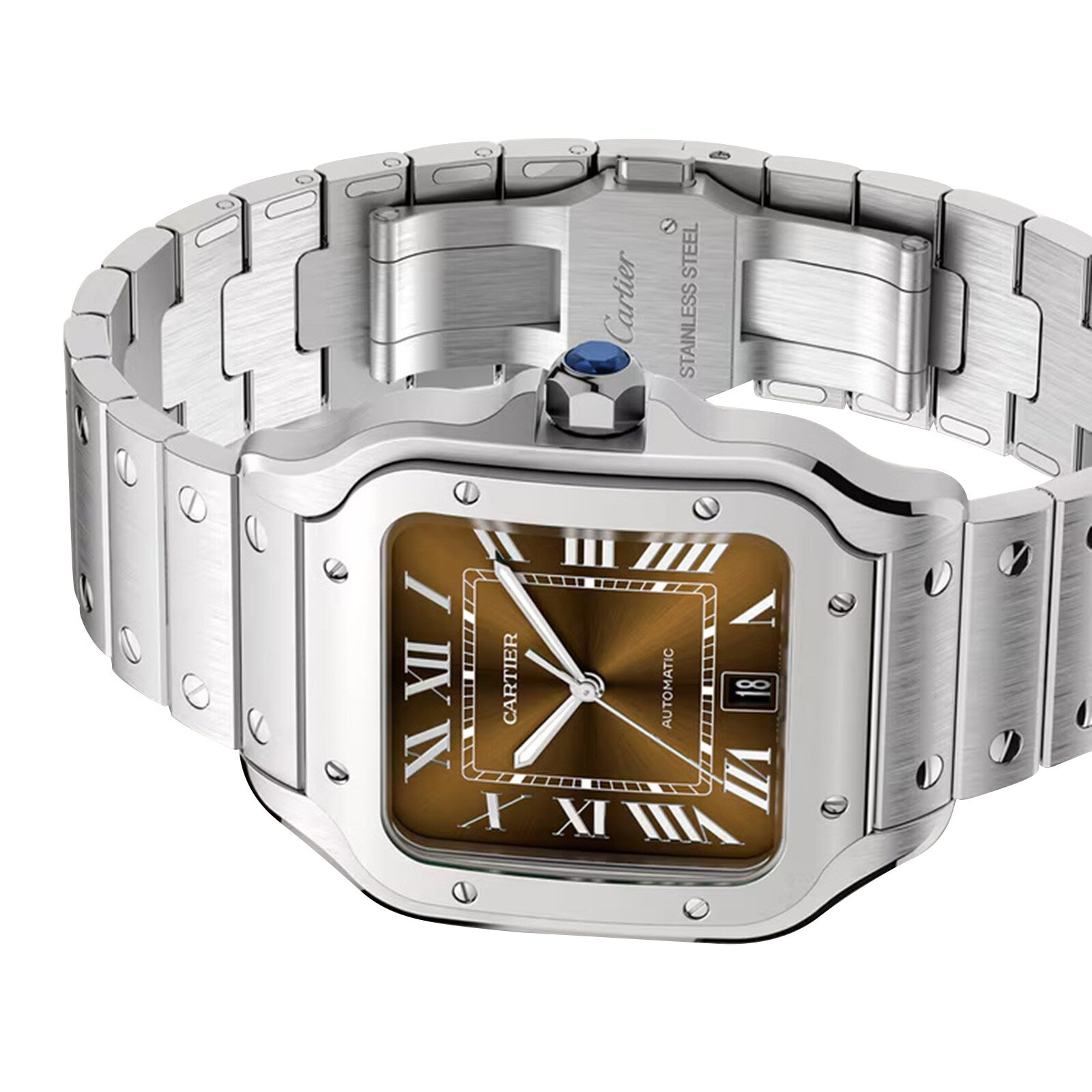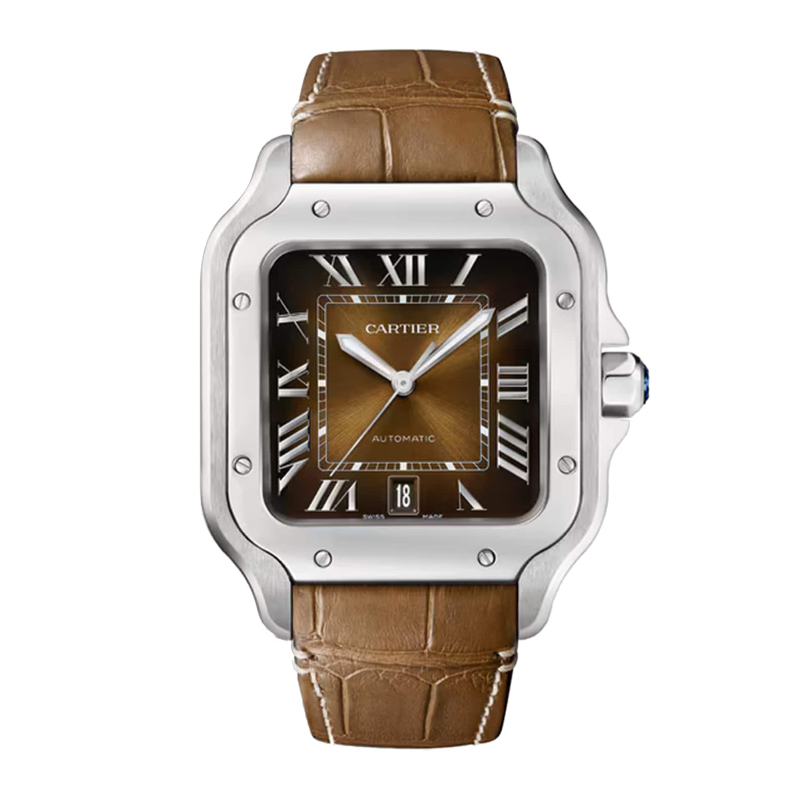 Santos Cartier - embodying minimalism Satin-finish gradated brown sunray-brushed dial with rhodium-finish sword-shaped hands Steel case with a 7-sided crown set with a synthetic faceted blue spinel Water resistant to 10 bar (100 metres) Mechanical movement with automatic winding, calibre 1847 MC UNDERSTATED ELEGANCE First crafted in 1904, the Santos de Cartier watch embodies minimalism, precise proportions, and meticulous detail. Inspired by the symmetrical geometry of Paris's streets, its iconic square case was specifically designed to be worn on the wrist. Over a century later, it remains a stylish and historically significant piece, beloved by bold individuals who push creative boundaries. The latest Santos de Cartier collection elevates Cartier's signature clean lines, geometric shapes, and exquisite details. Each watch showcases a decadent selection of dials, finishes, and materials, reflecting Cartier's commitment to elegance and innovation. The timeless appeal of the Santos de Cartier makes it a treasured accessory for those who value both history and modern style. SLEEK AND SIMPLE A declaration of sophisticated style. The Santos watch is rendered in a trusting steel case and features the iconic 7-sided crown set with a synthetic faceted blue spinel - reflecting Cartier's rich heritage. Inside, the calibre 1847 MC mechanical movement with automatic winding powers the watch. The brown sunray-brushed dial, adorned with rhodium-finish sword hands, elegantly displays Roman numerals beneath a sapphire crystal. The steel bracelet features the innovative "SmartLink" adjustment system for a perfect fit. The "QuickSwitch" system allows for easy interchangeability with an alligator leather strap secured by a steel buckle, too.