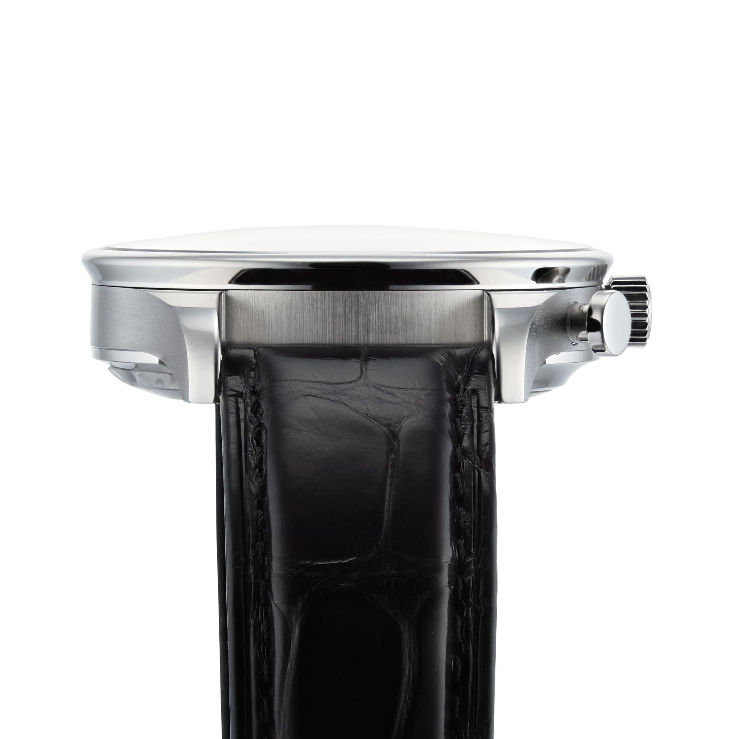 Reimagining an iconic design Powered by the IWC-manufactured 69355 calibre automatic movement Presented in a 41mm stainless steel case secured with a black alligator style leather strap Water resistant to 3 bar (30 metres) Visible internal column-wheel design A CLASSIC AESTHETIC An unequivocal icon, The Portugieser Chronograph showcases an intrinsic 1930s IWC Schaffhausen design, reimagined for the modern day. Timeless luxury meets unparalleled quality for a statement timepiece that is as functional as it is comfortable. Boasting clean, bold aesthetics on an open dial, this model benefits from a compact 41mm case diameter, housing a powerful IWC- manufactured 69355 calibre movement for expert timekeeping. TIMELESS AND ROBUST The case is encircled by a thin stainless steel bezel, giving the illusion of a much larger watch than its compact 41mm size. The bold, blue dial features applied Arabic numerals and slender silver Feuille hands. The characteristic réhaut evokes memories of the brands nautical heritage, printed with a quarter- second scale for excellent precision. The piece is paired with a black alligator style leather strap and secured with a robust butterfly folding clasp for elevated levels of comfort and is water resistant up to 3 bar (30 metres).