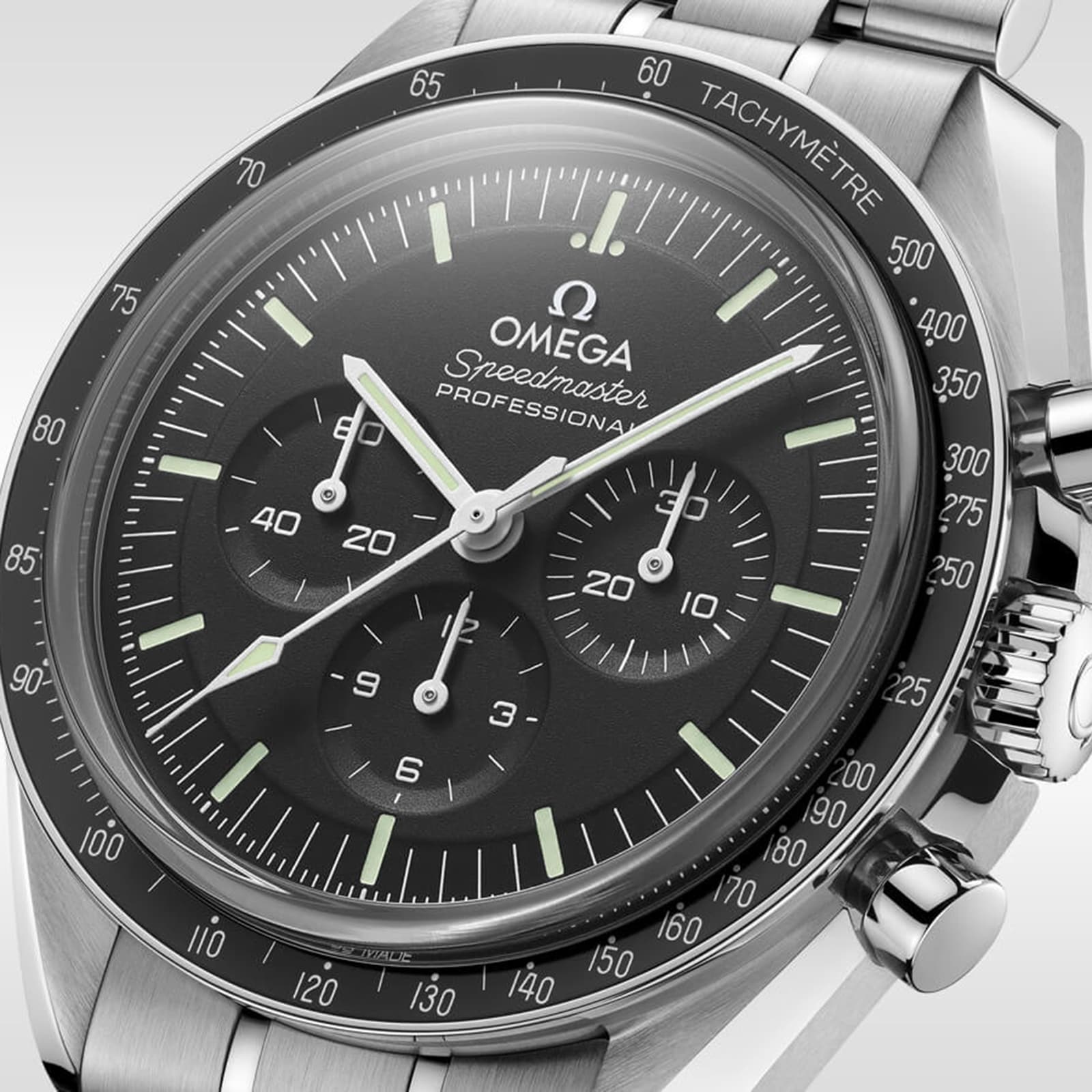 Inspired by the 4th generation Speedmaster style worn on the moon Driven by the 3861 calibre movement 42mm stainless steel case secured with a stainless steel strap Central chronograph function Co-Axial escapement for long-lasting precision LOVED ON EARTH AND BEYOND Inspired by the 4th generation Speedmaster style worn on the moon, the Speedmaster Moonwatch is one of Omega’s most iconic timepieces. Having been part of all six moon landings, this legendary watch captures the heart of brand’s pioneering spirit. Demonstrating the brand’s commitment to evolution, this new 2021 edition offers even more reliability, precision and excellence with Master Chronometer certification. LEGENDARY FEATURES Presented in an asymmetrical stainless steel case with a polished stainless steel bracelet, this 42mm watch features a black step dial with applied Omega logo and the iconic dot over 90 on the anodised aluminium bezel ring.