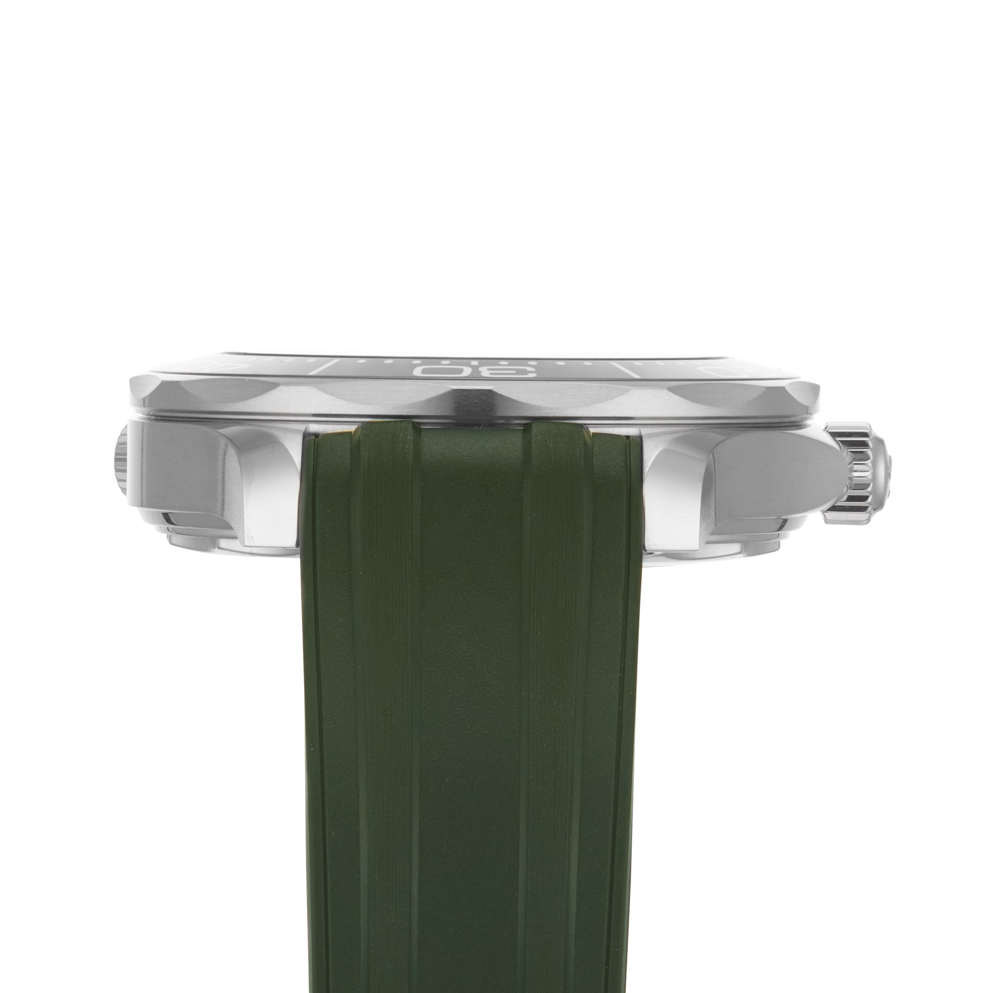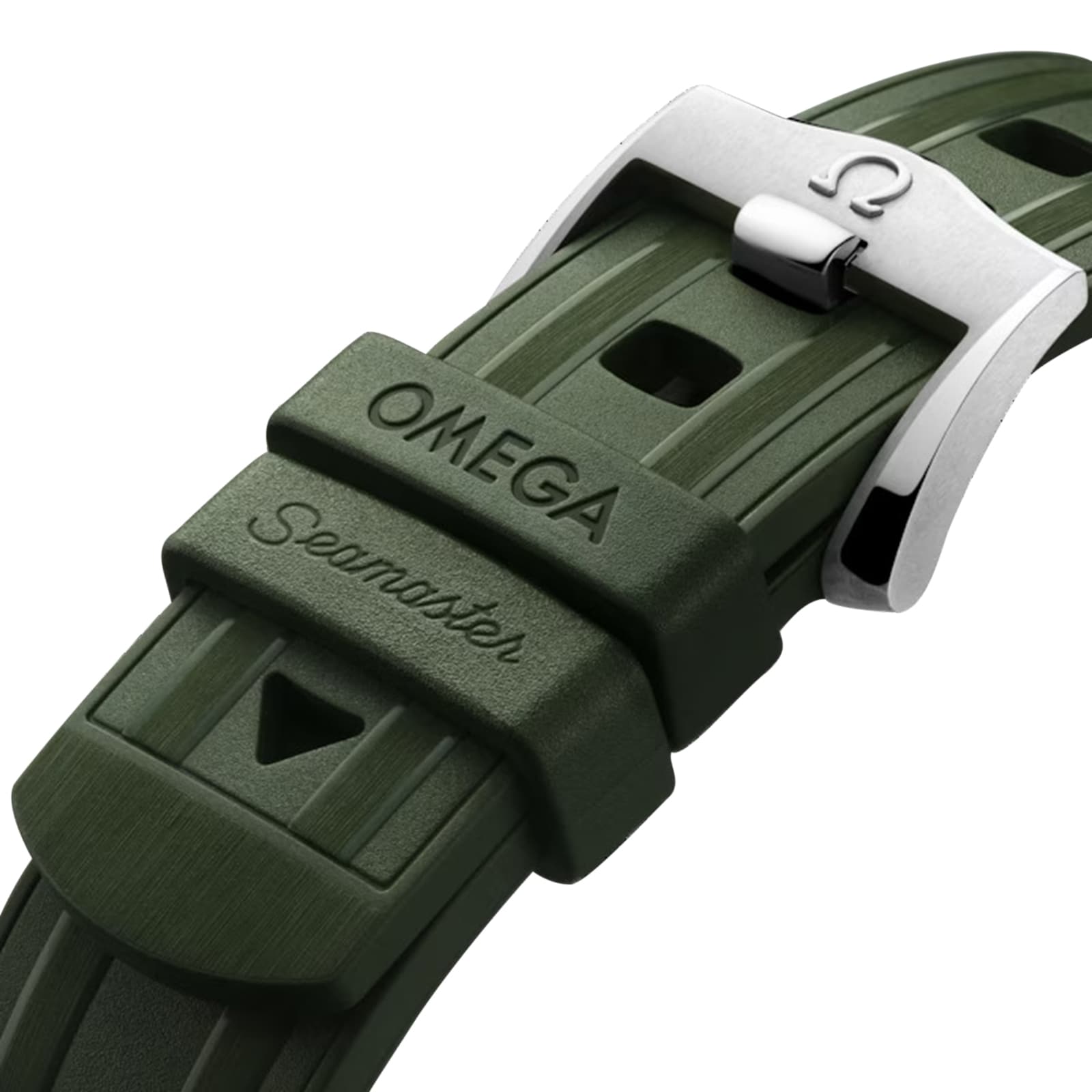 Designed for divers and professionals Water resistant to 30 bar (300 metres) MEGA Master Chronometer Calibre 8800 42mm stainless steel case paired with a striking green rubber strap Master Chronometer officially certified by METAS DIVE DEEP INTO EXTRAORDINARY TIMEKEEPING Paying tribute to Omega’s ocean heritage, the Seamaster Planet Ocean collection features Master Chronometer certification, advanced designs and water resistance to 30 bar (300 metres). Designed for use underwater, the Pro Diver collection includes co-axial escapement for long-lasting precision, a silicon balance spring for superior anti-magnetism, and a newly designed helium escape valve. ULTIMATE PRECISION This 42mm model is presented in a stainless steel case, framed by a green ceramic bezel with a white enamel diving scale, and presented on a green rubber strap. A further nod to the collection’s marine legacy, the polished green ceramic dial features a laser-engraved wave pattern and is organised with rhodium-plated skeleton hands and raised indexes coated in white Super-LumiNova for increased visibility. This Master Chronometer is certified by METAS and powered by the 8800 calibre movement for flawless precision.