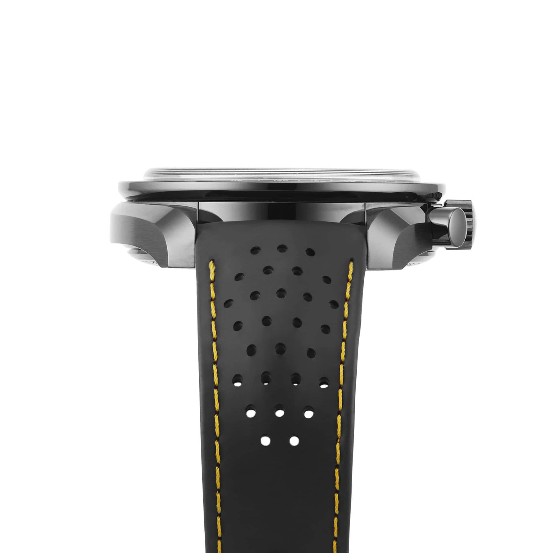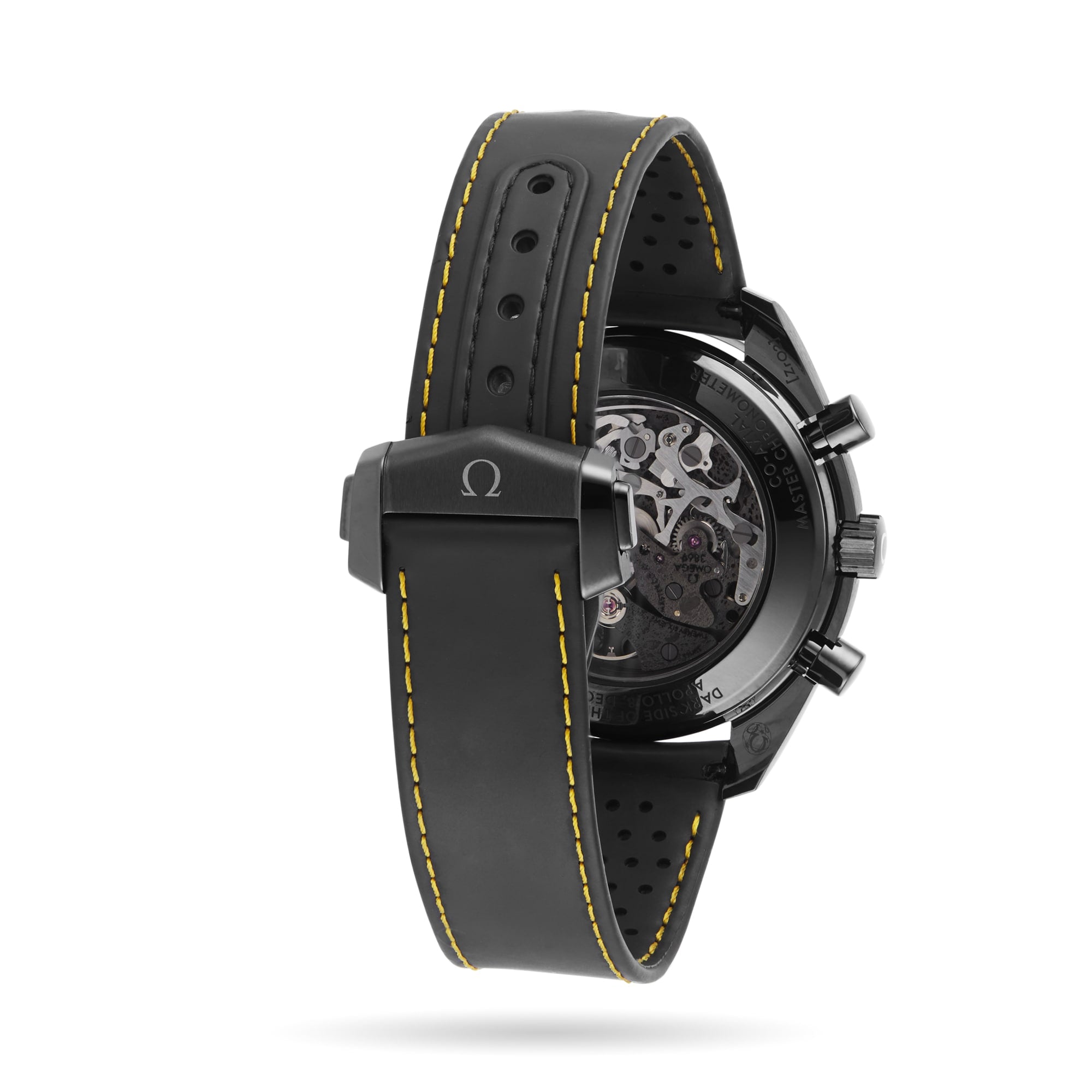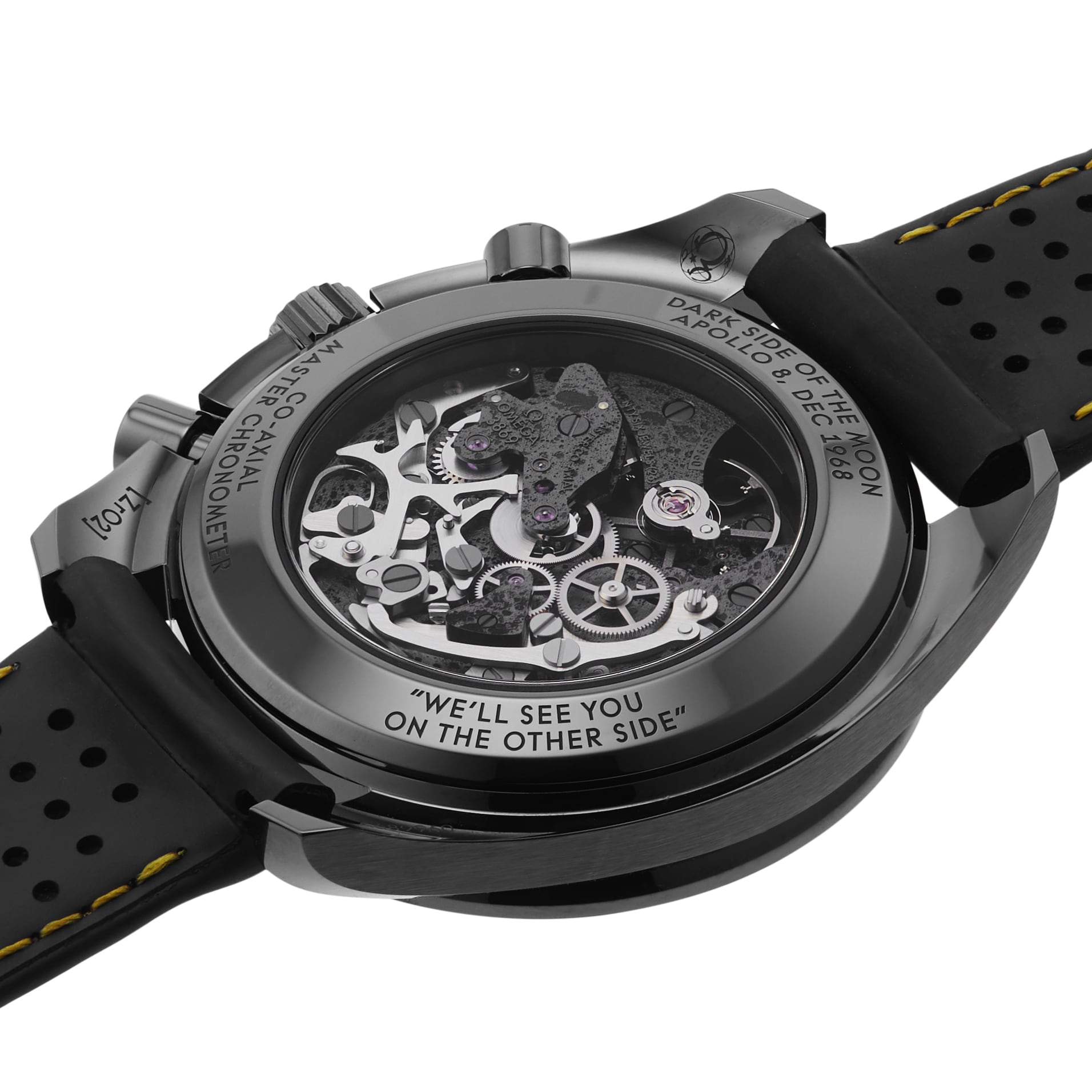 Speedmaster Moonwatch - a true icon of space Celebrating the model's history aboard the Apollo 8 mission Housed in a 44.25mm black ceramic case with a perforated black rubber strap Features chronograph, chronometer, and tachymeter functions Driven by a decorated OMEGA Co-Axial Master Chronometer Calibre 3869 movement THE DARK SIDE OF THE MOON In 1968, the crew of Apollo 8 became the first humans to see the dark side of the moon, orbiting the moon 10 times over 20 hours. The Omega Speedmaster Dark Side Of The Moon pays tribute to the Speedmaster Professional chronographs worn by every Apollo astronaut during this mission. Embodying the brand's pioneering spirit, this incredible chronograph is inspired by a legacy. Crafted from ceramic the bold chronograph features a skeletonised dial, a Saturn V rocket hand, and a decorated movement depicting the surface of the moon. BLACK SEDNA Sitting confidently within a 44.25mm black ceramic case, this striking model fastens securely with a perforated black rubber strap with a yellow rubber interior. The blackened OMEGA Co-Axial Master Chronometer Calibre 3869 movement has been laser-ablated on the main plate and bridges to represent the moon's surface. The near side can be viewed through the skeletonised black anodised aluminium dial, while the far side can be observed through the case back. The skeletonised dial is further elevated by a varnished yellow chronograph seconds hand, a small seconds sub-dial, and a grade 5 titanium hand shaped like the Saturn V rocket. The OMEGA Co-Axial Master Chronometer Calibre 3869 movement provides incredible power and precision, and is engraved with “Apollo 8, Dec 1968”, “Dark Side of the Moon”, “We'll see you on the other side”, and “Co-Axial Master Chronometer”.