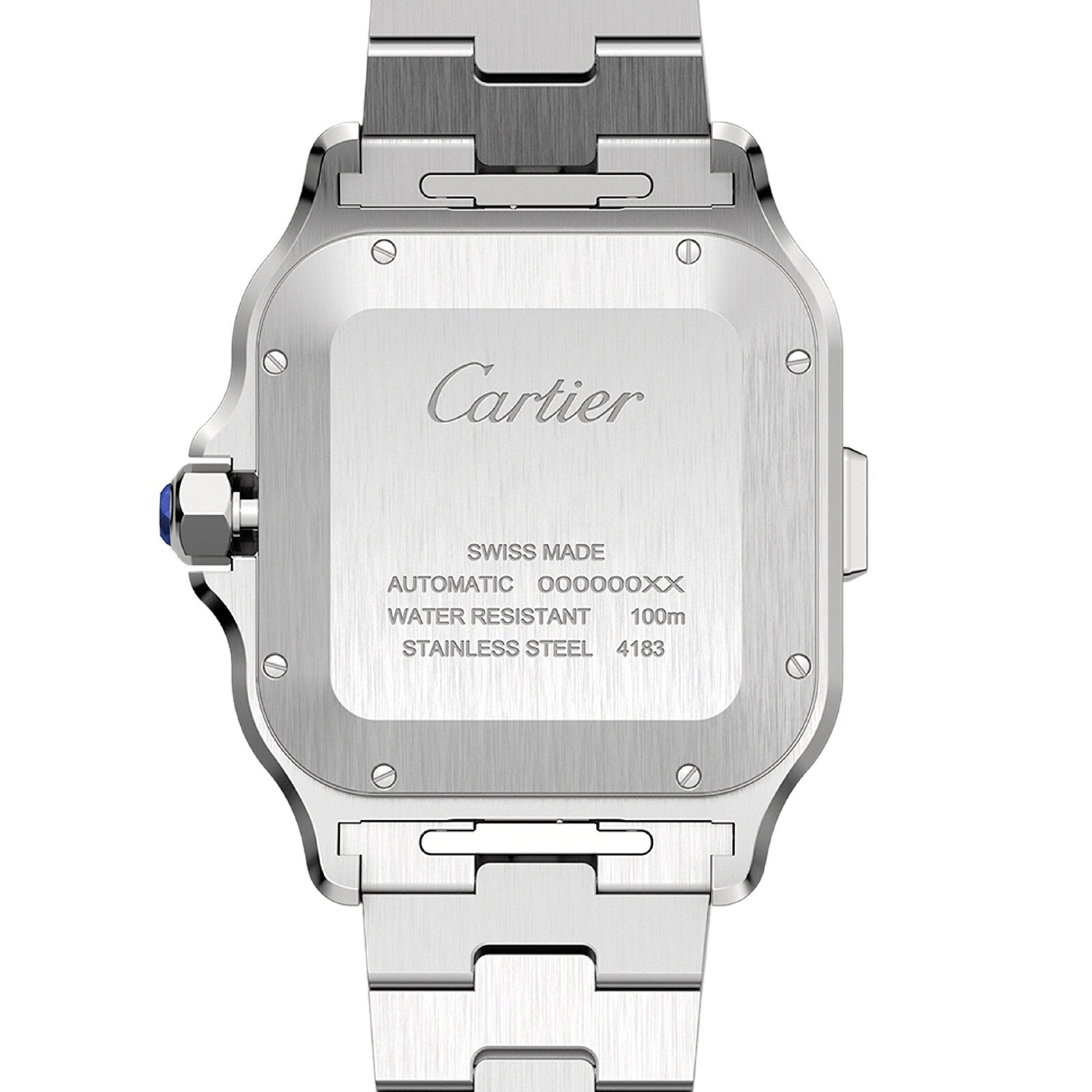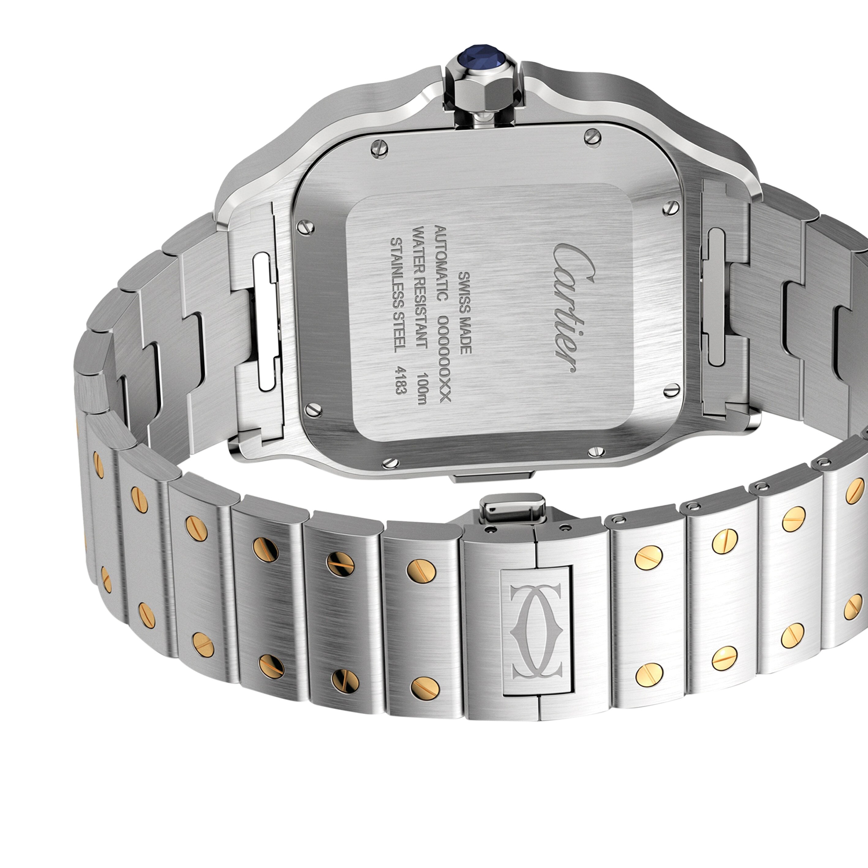 Santos watch, extra-large model, chronograph mechanical movement with automatic winding, caliber 1904 CH MC. Steel case, 18K yellow gold bezel, 7-sided crown set with a faceted blue synthetic spinel, satin-brushed silver dial, black steel sword-shaped hands with luminescent material, sapphire crystal. Steel bracelet with “SmartLink” adjustment system. Second strap in rubber, with steel folding buckle. Both bracelets are fitted with the “QuickSwitch” interchangeability system. Case width: 43.3 mm, case thickness: 12. 5 mm. Water-resistant up to 10 bar (approx. 100 meters). 1904, Louis Cartier granted the wish of the famous Brazilian aviator Alberto Santos Dumont: to be able to tell time while flying. The birth of one of the first ever wristwatches sealed the bonds of friendship between these two pioneers. The rounded angles of the dial, the seamless curve of the horns, and the exposed screws made for an iconic watch that would inspire countless reinterpretations. Explore the full Cartier range here.