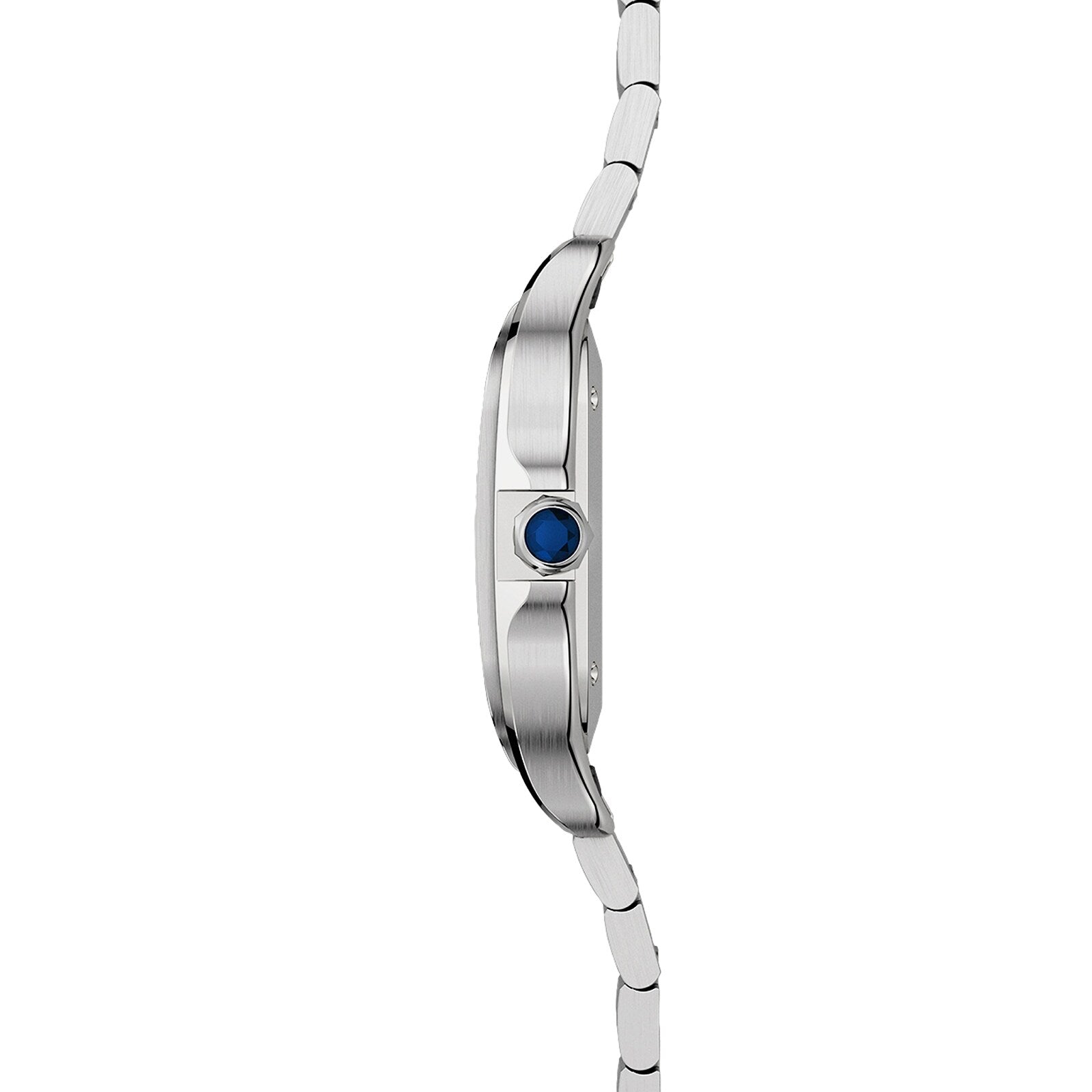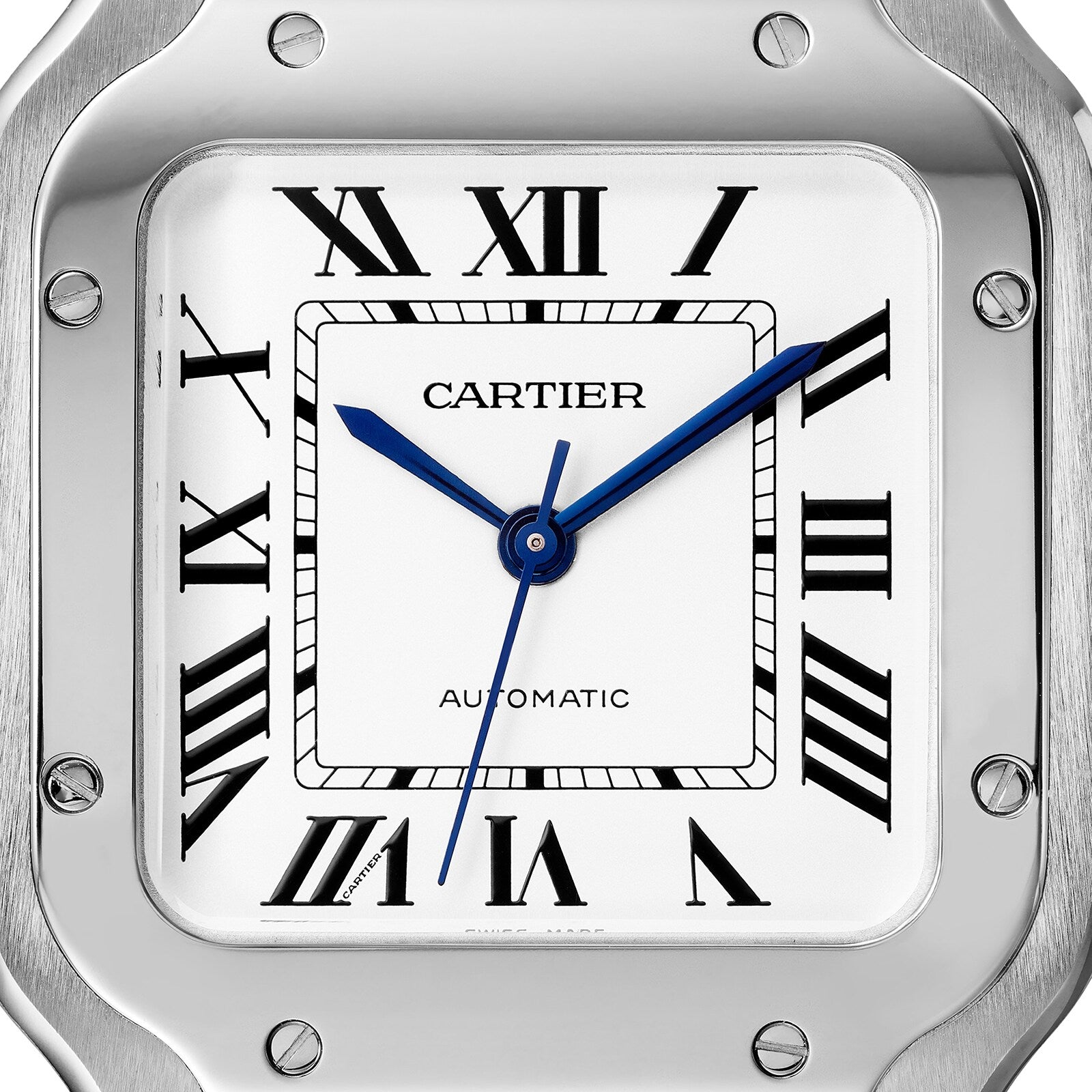 Santos de Cartier - a taste for minimalism Dedicated to aviation pioneer Alberto Santos-Dumont Housed in a beautifully proportioned square steel case with rounded corners Silvered opaline dial with blued-steel sword-shaped hands Powered with precision by the calibre 1847 MC self-winding mechanical movement with a 40-hour power reserve THE PRECISION OF PROPORTIONS Created in 1904, the Santos de Cartier collection pays tribute to aviation pioneer Alberto Santos-Dumont who inspired the original watch. Based on the concept of form, a taste for minimalism, the precision of proportions, and an eye for detail, the collection is characterised by its square case with rounded corners and functional screws that are deliberately left visible. AN EYE FOR DETAIL This 41.9 x 35.1mm watch is presented in a steel case with rounded corners and visible screws. A 7-sided crown with a vibrant faceted blue spinel adds to the signature aesthetic. The silvered opaline dial is instantly recognisable as being manufactured by Cartier, with steel Roman numerals and blued-steel sword-shaped hands. Allowing you to configure an accessory that feels uniquely yours, this timepiece is supplied with two straps - one in brown calfskin leather and the other in steel. Water resistant to 10 bar (100 metres) and equipped with a calibre 1847 MC self-winding mechanical movement, this exquisite model effortlessly balances function and form.