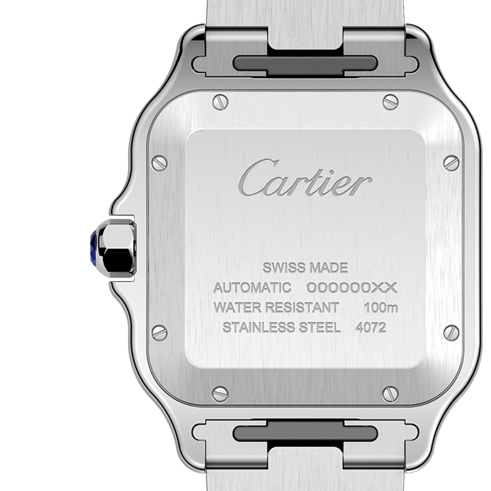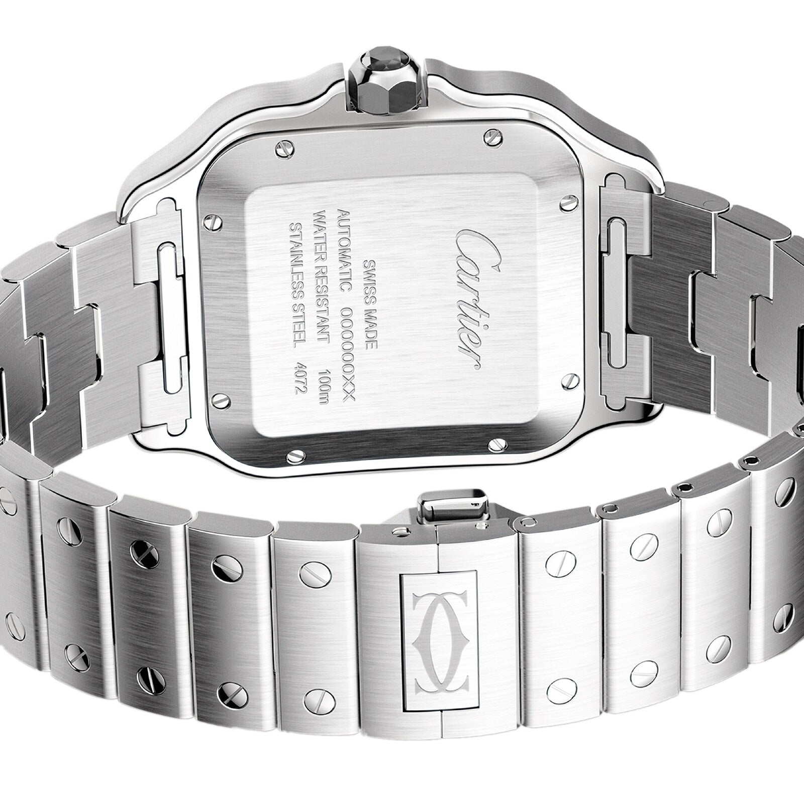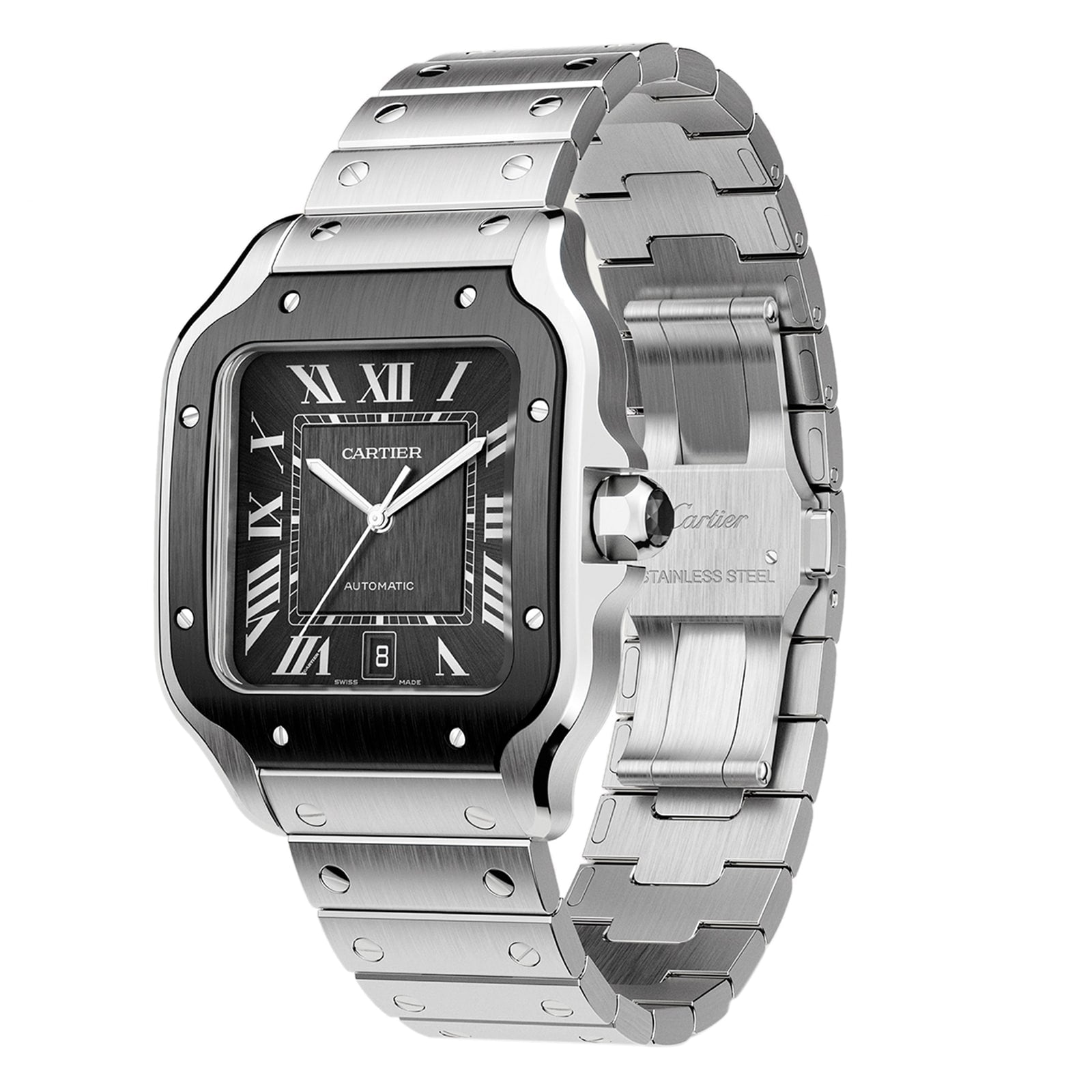 Santos de Cartier watch, large model, Manufacture mechanical movement with automatic winding, caliber 1847 MC. Steel case, ADLC bezel, steel crown set with a faceted black synthetic spinel, gray dial, steel sword-shaped hands with luminescent material, sapphire crystal. Steel bracelet with "SmartLink" adjustment system. Second strap in black rubber, with interchangeable steel deployant buckle. Both bracelets are fitted with the "QuickSwitch" interchangeability system. Case width: 39.8 mm, thickness: 9.38 mm. Water-resistant up to 10 bar (approx. 100 meters/100 feet). 1904, Louis Cartier granted the wish of the famous Brazilian aviator Alberto Santos Dumont: to be able to tell time while flying. The birth of one of the first ever wristwatches sealed the bonds of friendship between these two pioneers. The rounded angles of the dial, the seamless curve of the horns, and the exposed screws made for an iconic watch that would inspire countless reinterpretations. Explore the full Cartier range here.