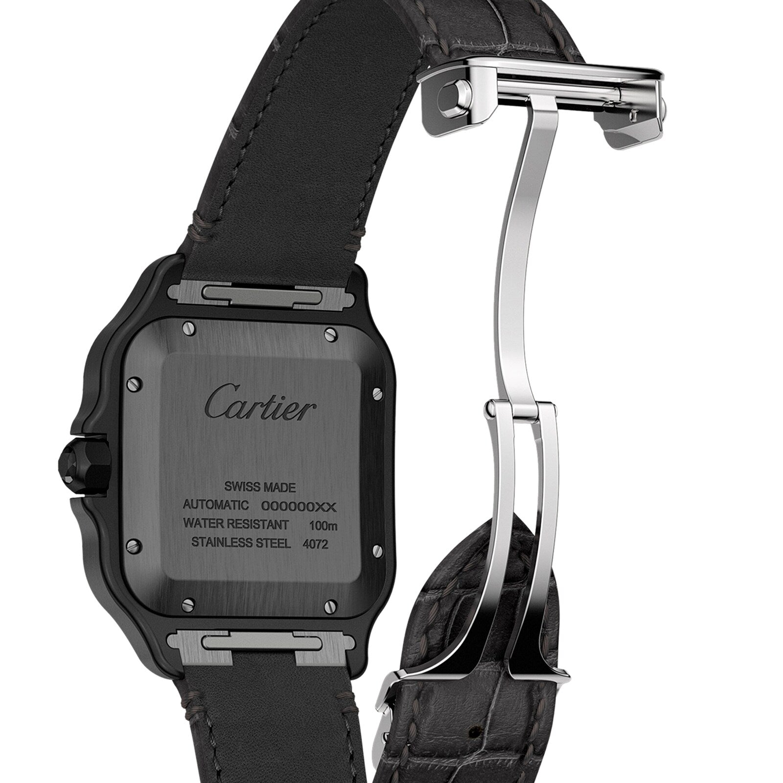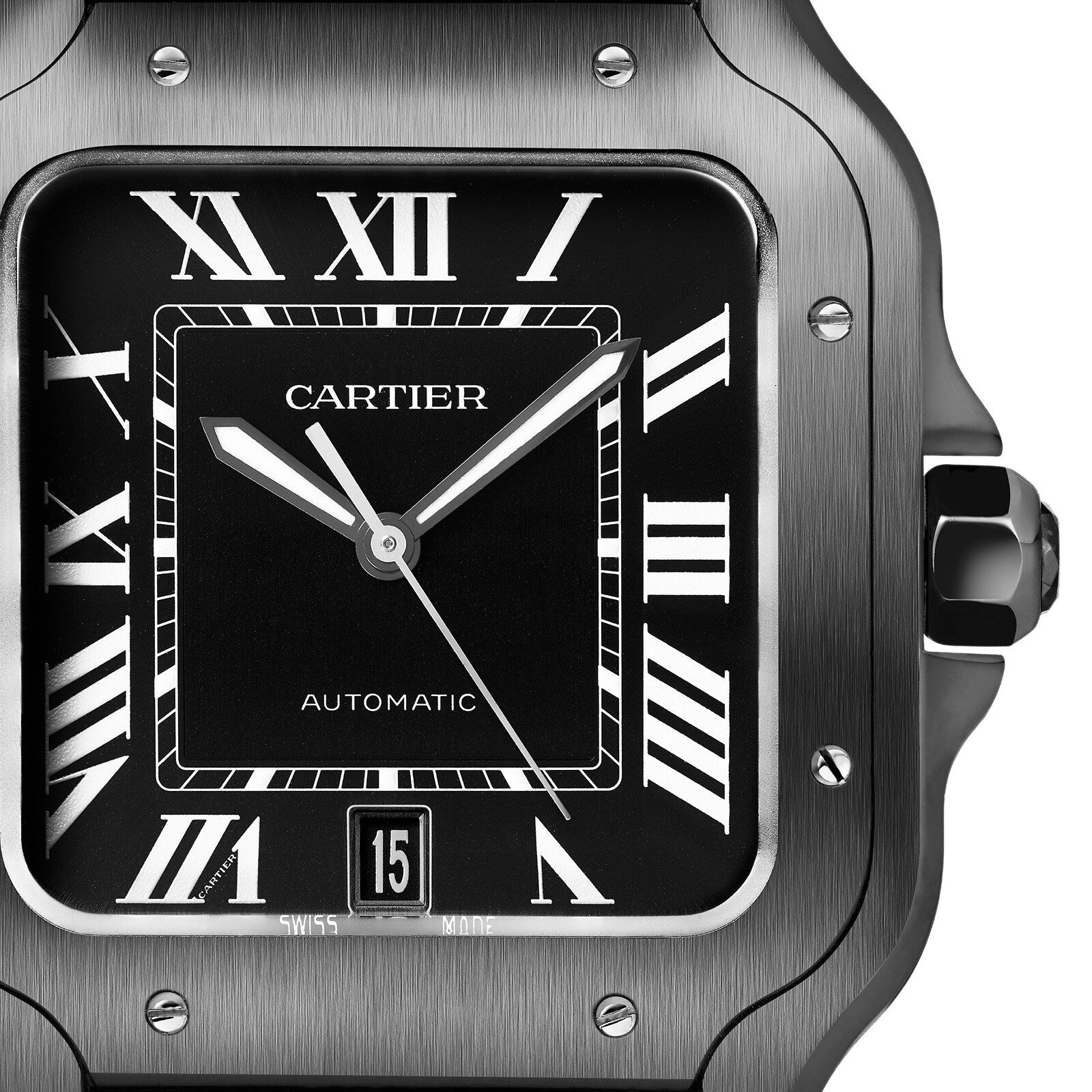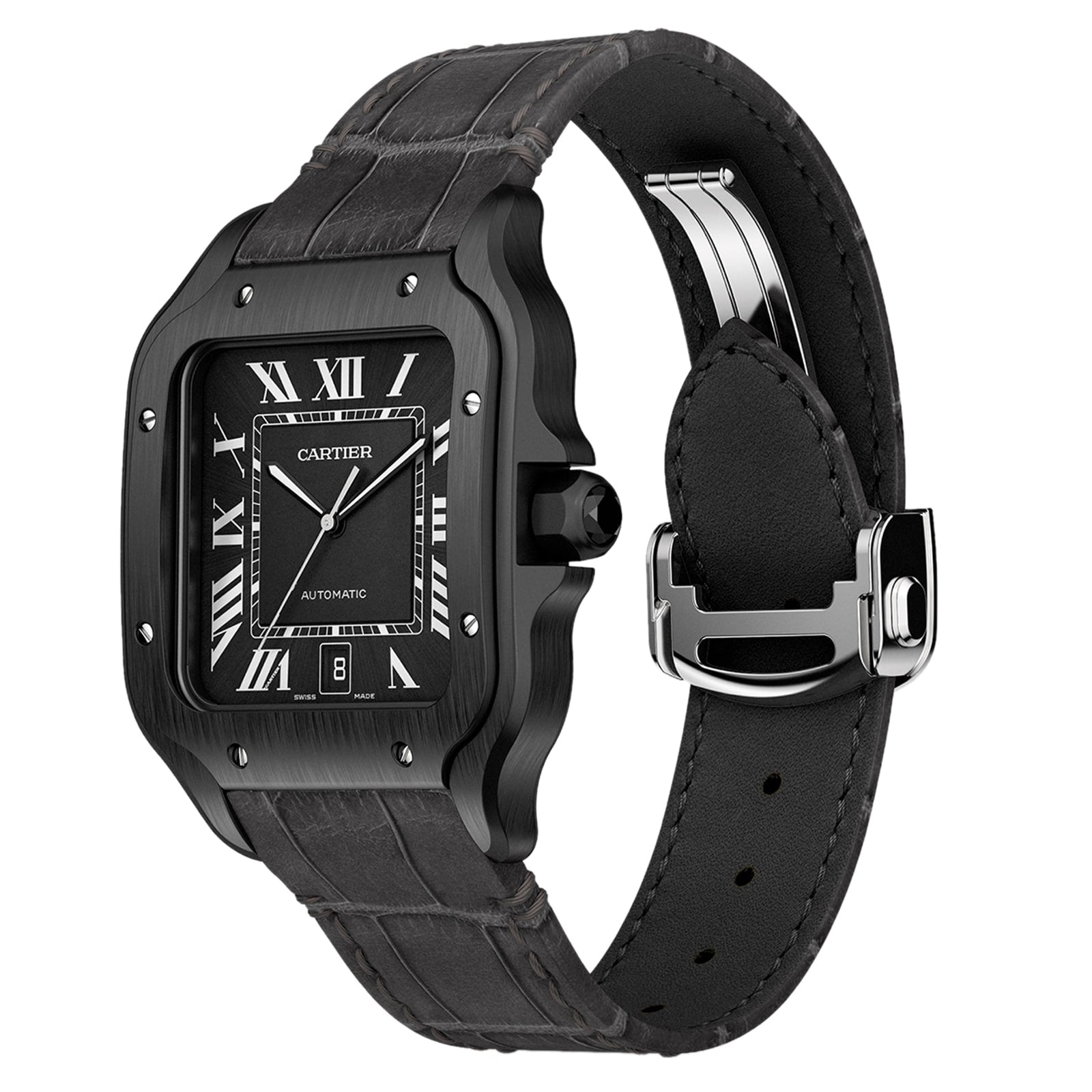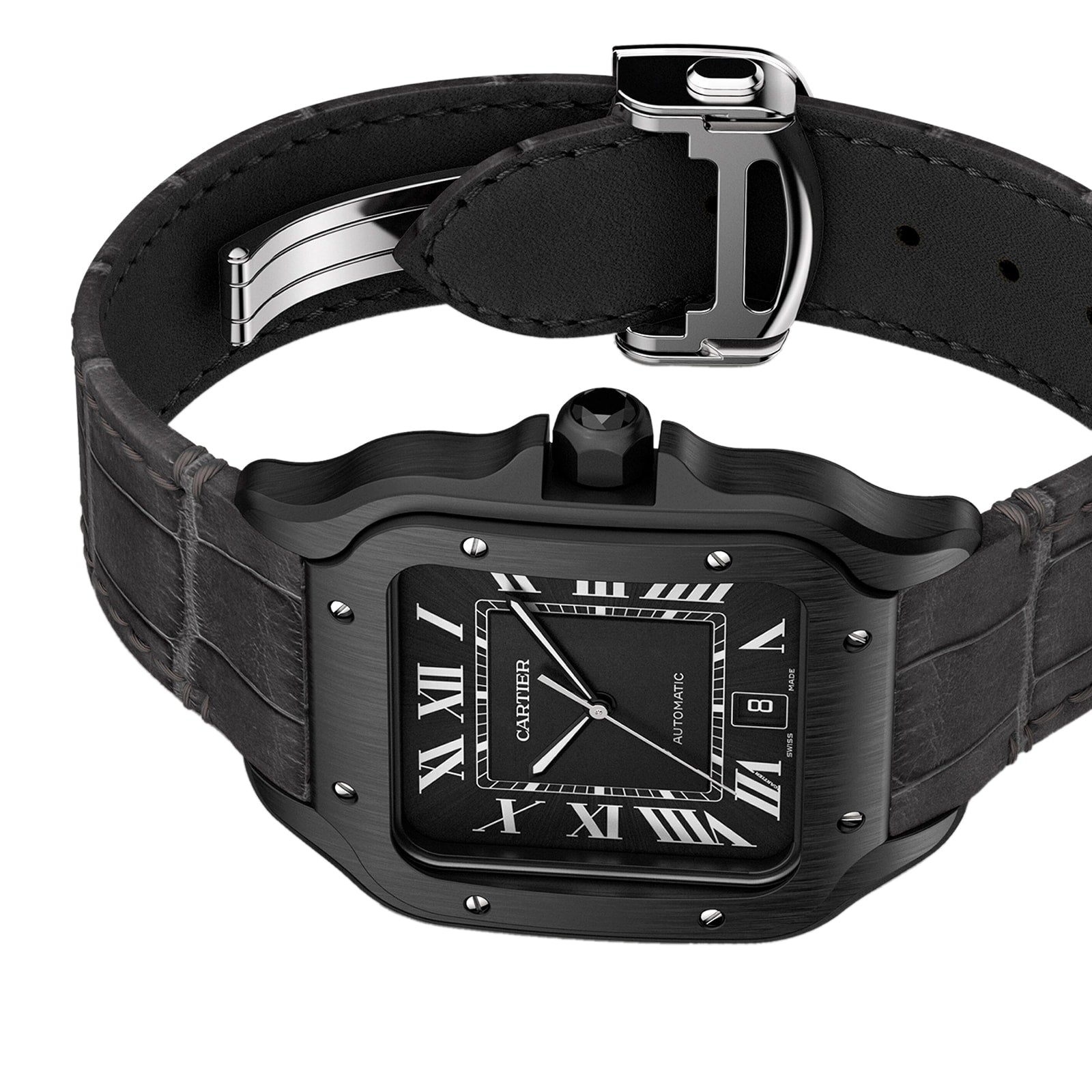 Santos de Cartier watch, large model, Manufacture mechanical movement with automatic winding, caliber 1847 MC. Bezel and case in steel and ADLC, steel crown set with a black faceted synthetic spinel, black dial, black steel sword-shaped hands with luminescent material, sapphire crystal. A rubber strap, second strap in black alligator leather, steel interchangeable deployant buckle. Both bracelets are equipped with the “QuickSwitch” interchangeability system. Case width: 39.8 mm, thickness: 9.38 mm. Water-resistant up to 10 bar (approx. 100 meters/100 feet). 1904, Louis Cartier granted the wish of the famous Brazilian aviator Alberto Santos Dumont: to be able to tell time while flying. The birth of one of the first ever wristwatches sealed the bonds of friendship between these two pioneers. The rounded angles of the dial, the seamless curve of the horns, and the exposed screws made for an iconic watch that would inspire countless reinterpretations. Explore the full Cartier range here.