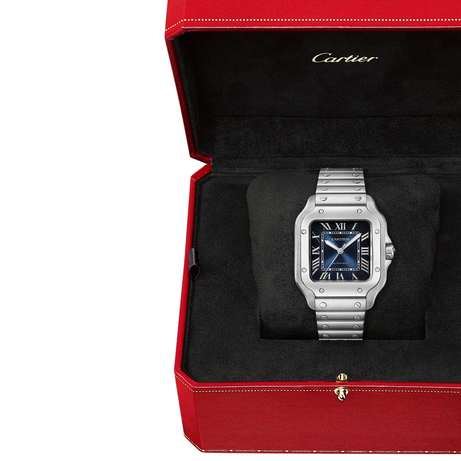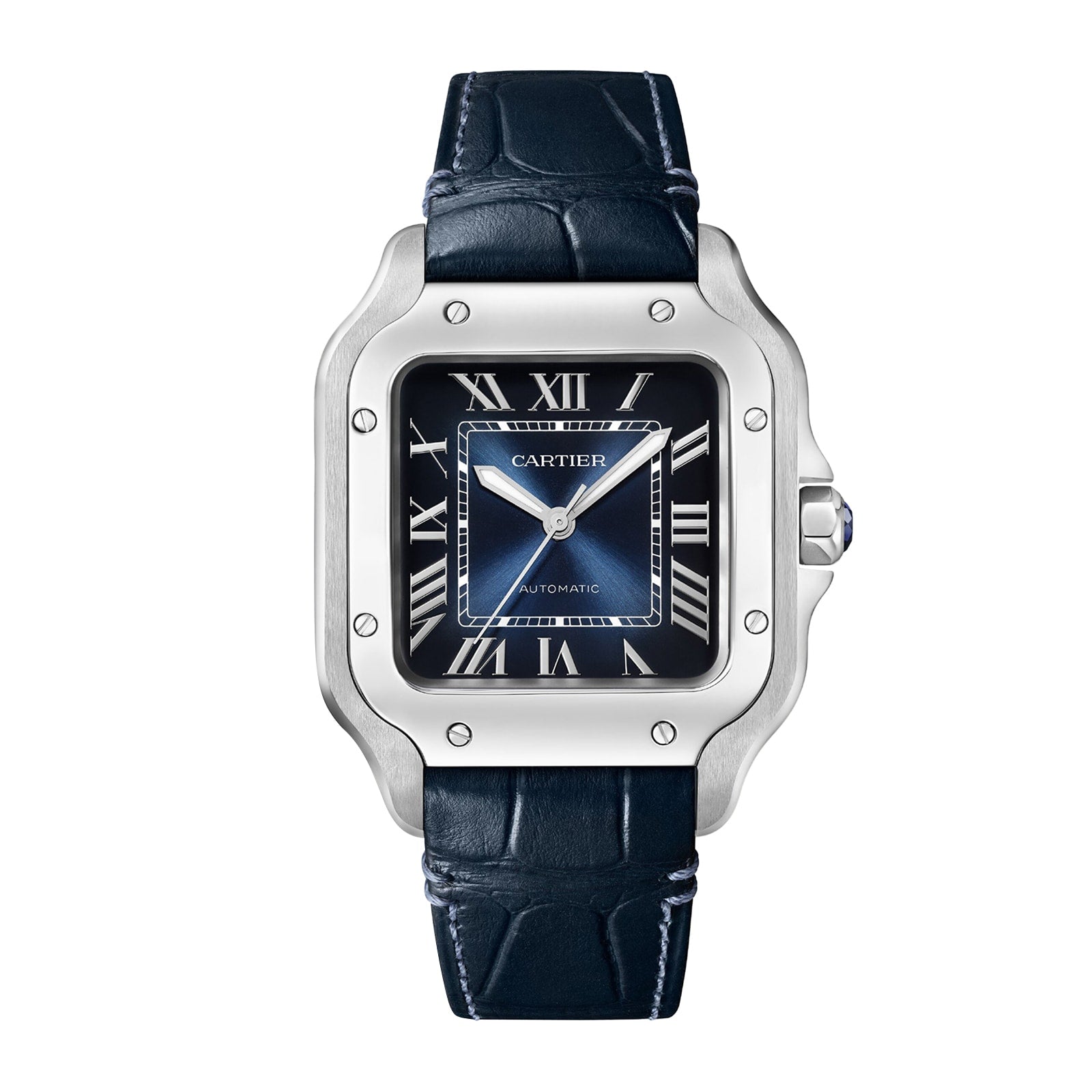 Santos de Cartier - where precision meets minimalism A tribute to aviation innovator Alberto Santos-Dumont Encased in a balanced square steel frame Graduated blue dial with polished steel sword-shaped hands Powered by the calibre 1847 MC self-winding mechanical movement for flawless precision SIGNATURE DESIGN First crafted in 1904, the Santos de Cartier collection honours Alberto Santos-Dumont, the visionary aviator behind the original inspiration. With its focus on form, minimalist elegance, precise proportions, and refined detail, the collection is defined by its square case, softened by rounded corners and accented with exposed screws for a bold, functional aesthetic. Although the collection has been updated over the years, it retains the key elements that make it instantly recognisable to aviation enthusiasts and watch collectors alike. ATTENTION TO DETAIL This timepiece is housed in a rounded square steel case with visible screws and a distinctive 7-sided crown featuring a striking faceted blue spinel. The deep blue sunray dial exudes sophistication, complemented by steel Roman numerals and matching sword-shaped hands. Complete with two straps - one in blue alligator leather and the other in polished steel - this watch can be easily customised to reflect your personal sense of style. Water resistant to 10 bar (100 metres) and powered by the calibre 1847 MC self-winding mechanical movement, this timepiece balances functionality with timeless design.