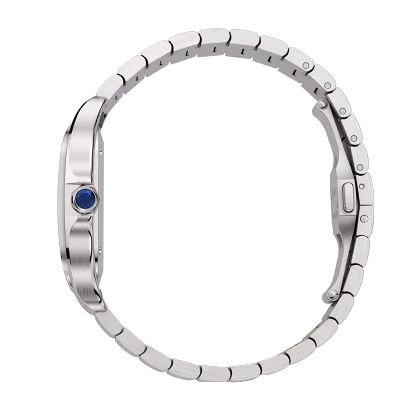 Santos Cartier - embodying minimalism Satin-finish gradated brown sunray-brushed dial with rhodium-finish sword-shaped hands Steel case with a 7-sided crown set with a synthetic faceted blue spinel Water resistant to 10 bar (100 metres) Mechanical movement with automatic winding, calibre 1847 MC UNDERSTATED ELEGANCE First crafted in 1904, the Santos de Cartier watch embodies minimalism, precise proportions, and meticulous detail. Inspired by the symmetrical geometry of Paris's streets, its iconic square case was specifically designed to be worn on the wrist. Over a century later, it remains a stylish and historically significant piece, beloved by bold individuals who push creative boundaries. The latest Santos de Cartier collection elevates Cartier's signature clean lines, geometric shapes, and exquisite details. Each watch showcases a decadent selection of dials, finishes, and materials, reflecting Cartier's commitment to elegance and innovation. The timeless appeal of the Santos de Cartier makes it a treasured accessory for those who value both history and modern style. SLEEK AND SIMPLE A declaration of sophisticated style. The Santos watch is rendered in a trusting steel case and features the iconic 7-sided crown set with a synthetic faceted blue spinel - reflecting Cartier's rich heritage. Inside, the calibre 1847 MC mechanical movement with automatic winding powers the watch. The brown sunray-brushed dial, adorned with rhodium-finish sword hands, elegantly displays Roman numerals beneath a sapphire crystal. The steel bracelet features the innovative "SmartLink" adjustment system for a perfect fit. The "QuickSwitch" system allows for easy interchangeability with an alligator leather strap secured by a steel buckle, too.