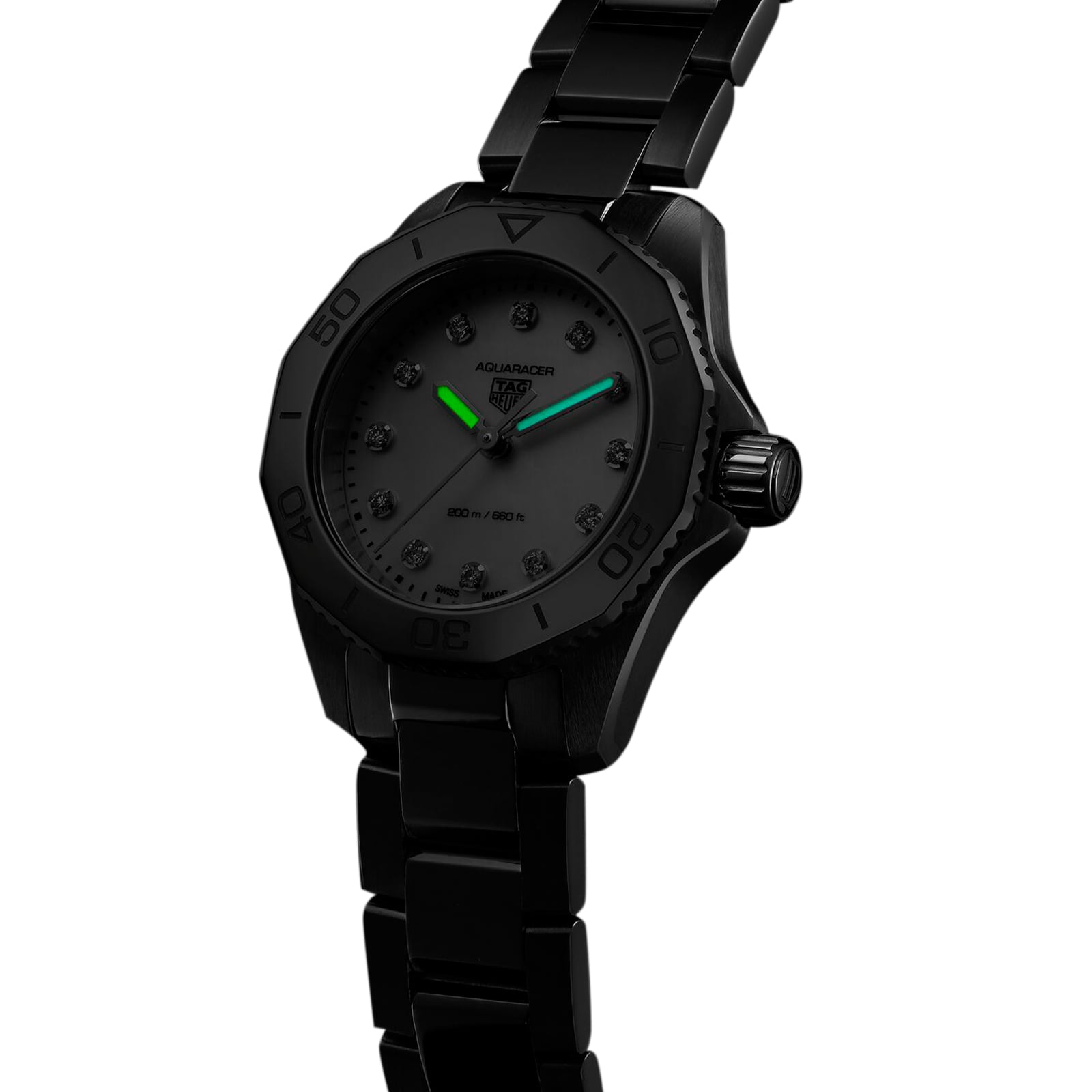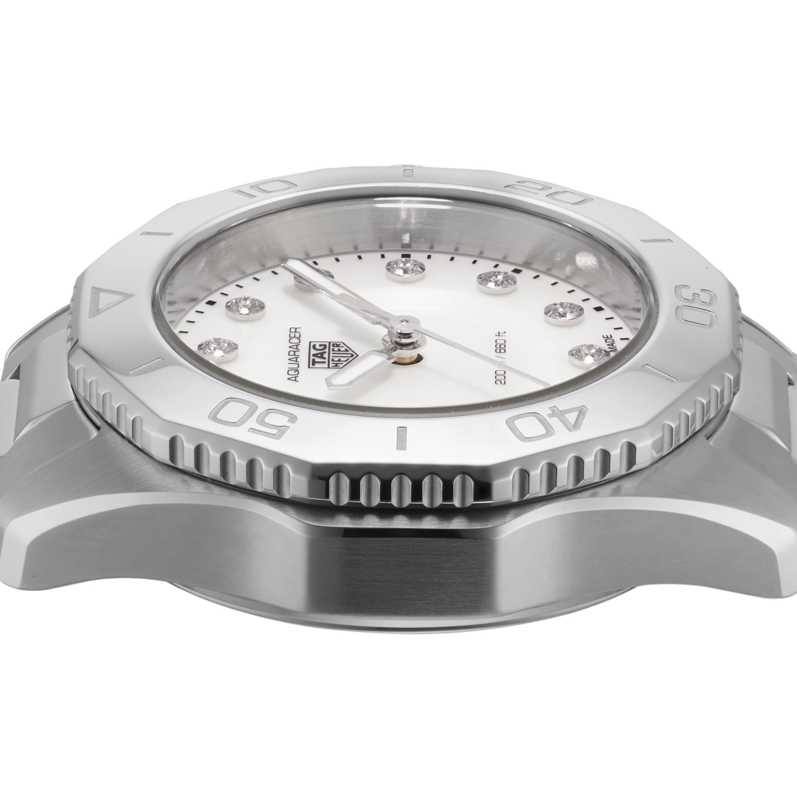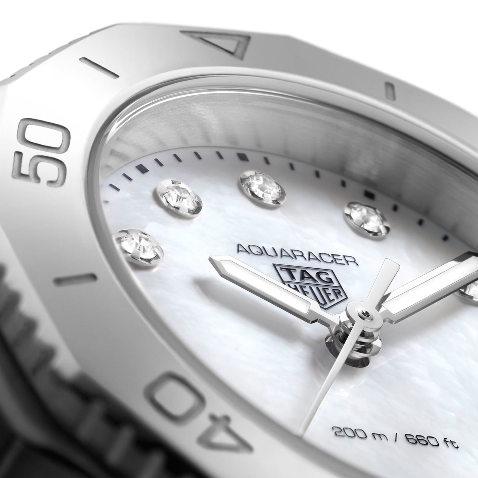 Aquaracer – pushing limits in search of greater performance Robust construction and bold design Refined 30mm stainless steel case with a co-ordinating bracelet White mother-of-pearl dial with glistening diamond hour markers Powered by a reliable Quartz movement A DARING SPIRIT Re-launched in 2021, the Aquaracer collection has re-written sports watch design and performance codes to take wearers beyond the edge as they push their limits in search of ever-greater performance. The Aquaracer Professional 200 collection unites robust construction with boldness of design. Designed to go anywhere in style, the 30mm stainless steel case embraces refined ergonomics and finishes, while a white mother-of-pearl dial adds an element of style with glistening diamond hour markers. EXCEPTIONAL FUNCTIONALITY This confident 30mm model pairs a stainless steel case with a co-ordinating steel bracelet. The ethereal white mother-of-pearl dial creates a beautiful contrast against the robust, sports-inspired case and bezel, with glistening diamond hour markers and hands filled with Super-LumiNova for enhanced visibility, day and night. Quartz movement ensures this timepiece is reliable in every way, while water resistance to 20 bar (200 metres) improves performance.