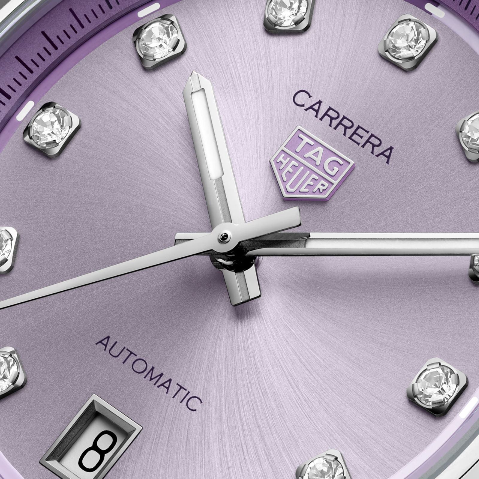 The TAG Heuer Carrera Date in 36 mm brings a fresh touch to the collection with a captivating lilac dial. Featuring diamond-set indexes and powered by the Calibre 7 movement, this timepiece combines elegance with precision. The lilac snail-brushed dial adds a dynamic touch, highlighted by a gradient track circling the dial. The diamond-set indexes enhance the refined look, bringing timeless style to the fore. The tapered H-shaped bracelet ensures comfort and style, offering a perfect fit for every wrist. The fine-brushed and polished steel case and domed sapphire crystal complete the elegant design. Powered by the Calibre 7 automatic movement, the watch delivers 56 hours of power reserve. The angled date window at 6 o'clock ensures practicality without compromising on aesthetics.