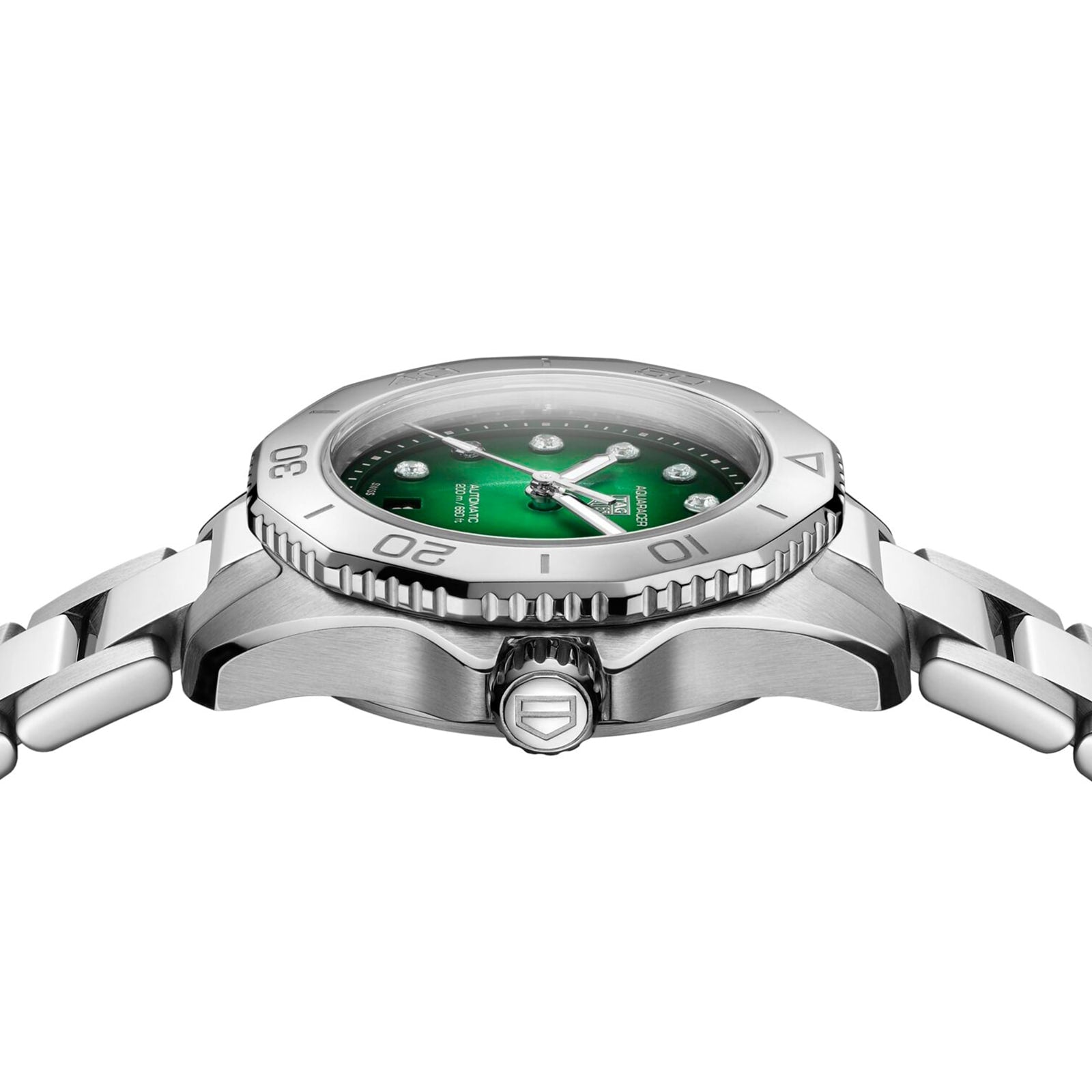 Aquaracer- the ultimate outdoor watch Presented in a 30mm steel case with a co-ordinating bezel Powered by quartz chronograph movement Forest green dial with sparkling diamond indexes Complete with water resistance to 20 bar (200 metres) A NEW ERA Re- launched in 2021, the Aquaracer collection has rewritten sports watch design and performance codes to take wearers beyond the edge as they push their limits in search of ever-greater performance. The TAG Heuer Aquaracer Professional 200 is the latest chapter in the story of this iconic collection. Clean and colourful, this model is the ultimate go-anywhere watch, designed to cross time zones and dive and surf all over the world. Combining a fresh and sporty style with extreme technical construction, this high- performance timepiece is characterised by an elegant yet functional 30mm case featuring 20 bar (200 metres) of water resistance. TIMELESS ELEMENTS This dazzling Aquaracer model features a 30mm stainless steel case with a co-ordinating bracelet and ergonomic bezel. The striking forest green dial is luxurious in its simplicity, with 12 sparkling diamond dot hour markers and Super- LumiNova® applied hour and minute hands for complete legibility. Powered by Calibre 9 Automatic movement, this timepiece offers superior accuracy in addition to its sleek design.