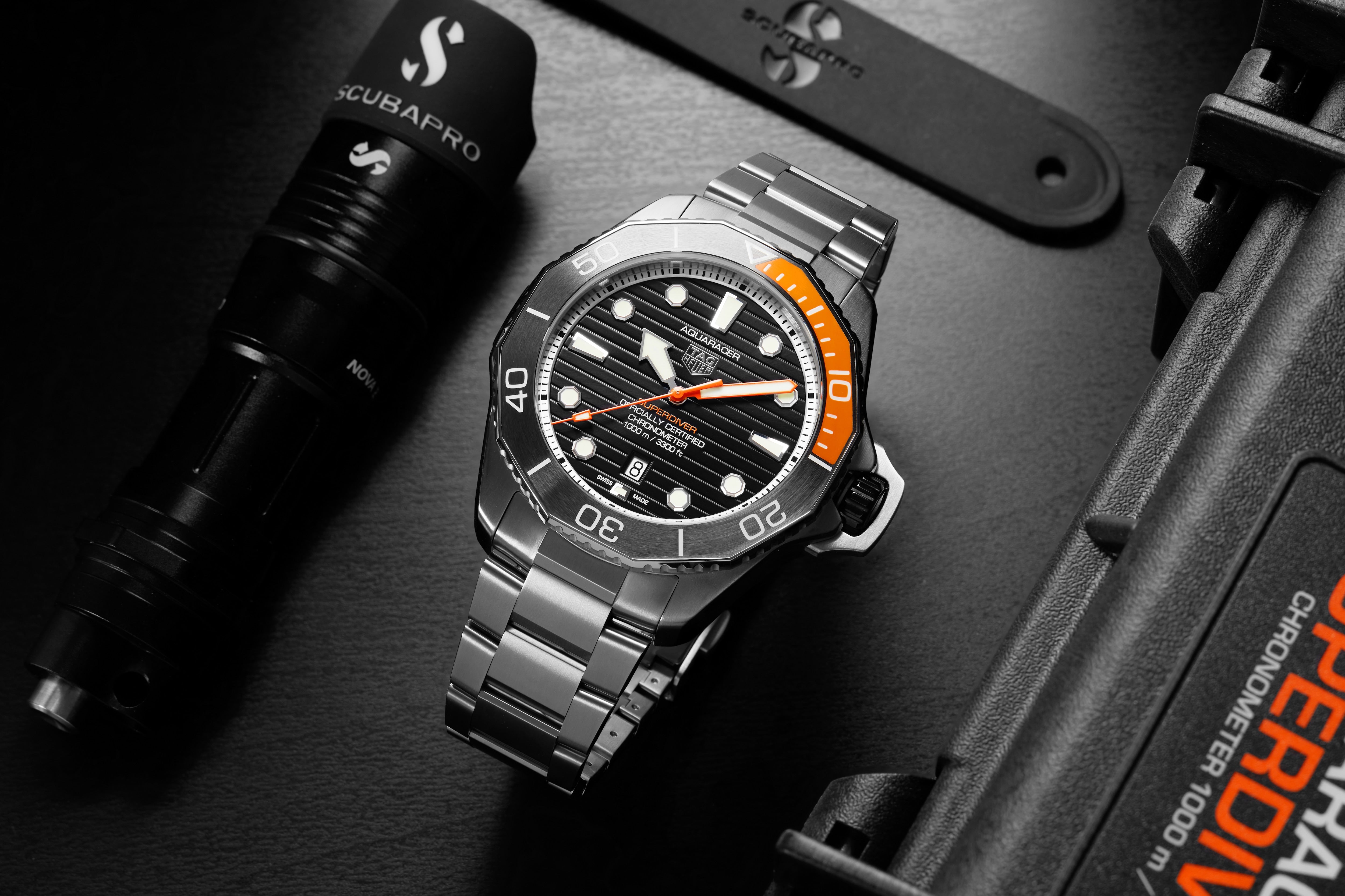 Aquaracer - pushing limits in search of greater performance The ultimate go-anywhere watch Extreme 45mm grade 5 titanium case and bracelet Powered by the COSC certified TH30-00 calibre movement Water resistance to 100 bar (1000 metres) THE AQUARACER COLLECTION Re-launched in 2021, the Aquaracer collection has re-written sports watch design and performance codes to take wearers beyond the edge as they push their limits in search of ever-greater performance. This TAG Heuer Aquaracer Professional 1000 model has been built for ultimate reliability and optimal precision during saturation dives. AQUA FORCE Designed to endure any and all conditions, this 45mm model pairs a grade 5 titanium bracelet with a co-ordinating titanium case, offering water resistance to 100 bar (1000 metres). The robust ceramic GMT bezel displays a 24-hour scale and is split into two colours - deep black represents the night time hours of 6 in the evening to 6 in the morning, while striking green indicates the hours of 6 in the morning through to 6 in the evening. The black sunray dial plays host to large luminescent hour minute hands and indexes, a date display at 6 o'clock, and a vibrant orange second hand. This watch is powered by TH30-00 calibre movement which provides the piece with official COSC certified chronometer status. The complete package, this watch is presented in a waterproof, crushproof, dustproof, and corrosion proof case.