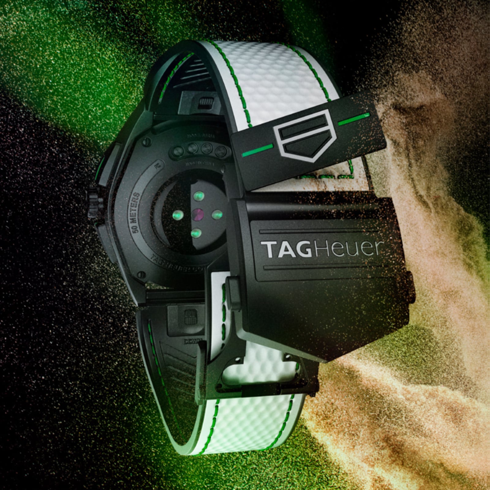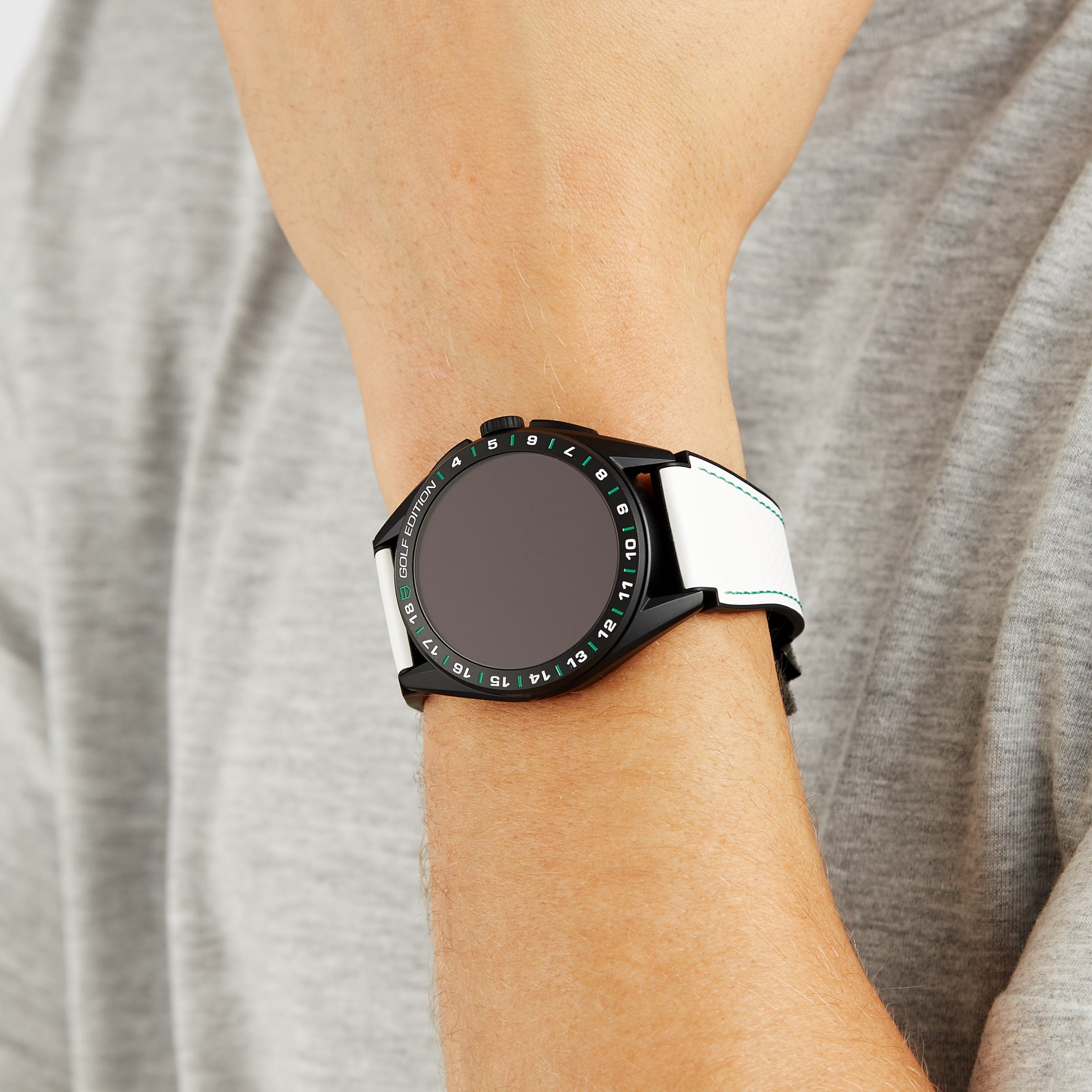 Connected Calibre E4 - luxury meets performance Special Golf Edition offering an exceptional playing experience for golfers Features new full shot tracking functionality Crafted from ultra-light Grade 2 titanium Featuring the TAG Heuer sports exclusive application THE NEXT GENERATION OF TIMEKEEPING Bringing together avant-garde design and cutting edge technology, the Connected Calibre E4 collection delivers peak performance and unmatched elegance. Finding the perfect balance between innovation and high end watchmaking, the Connected collection allows you to do everything from track your workout to display your virtual artwork, and everything in between. This special Golf Edition acts as the perfect caddie on your wrist, helping you identify the distance for the next shot, recommending the best choice of club, and highlighting hazards and distances on high-resolution maps of more than 40, 000 golf courses worldwide. CRAFTED FOR PERFORMANCE AND STYLE Crafted from ultra-light Grade 2 titanium, the 45mm case features matt, sandblasted DLC finishing, and sharp, sporty lugs. Adding to the elegant yet sporty aesthetic, the bezel features hole numbering from 1 to 18, while the timepiece is supplied with both a black rubber strap, and a white rubber strap with a golf pattern and ball marker integrated into the buckle. Powered by Wear OS by Google, this state-of-the-art smart watch offers extensive functionality, including a heart rate monitor, compass, microphone, and barometer, as well as pre-installed apps, such as TAG Heuer Golf, TAGE Heuer Sports, and TAG Heuer Wellness. The TAG Heuer sports exclusive application offers the functionality needed to take on any challenge and can be personalised to your goals. Or, if you're more interested in NFTs, you can transfer your favourite NFTs to your new Lens watch face and display your collectible virtual artworks on your wrist.