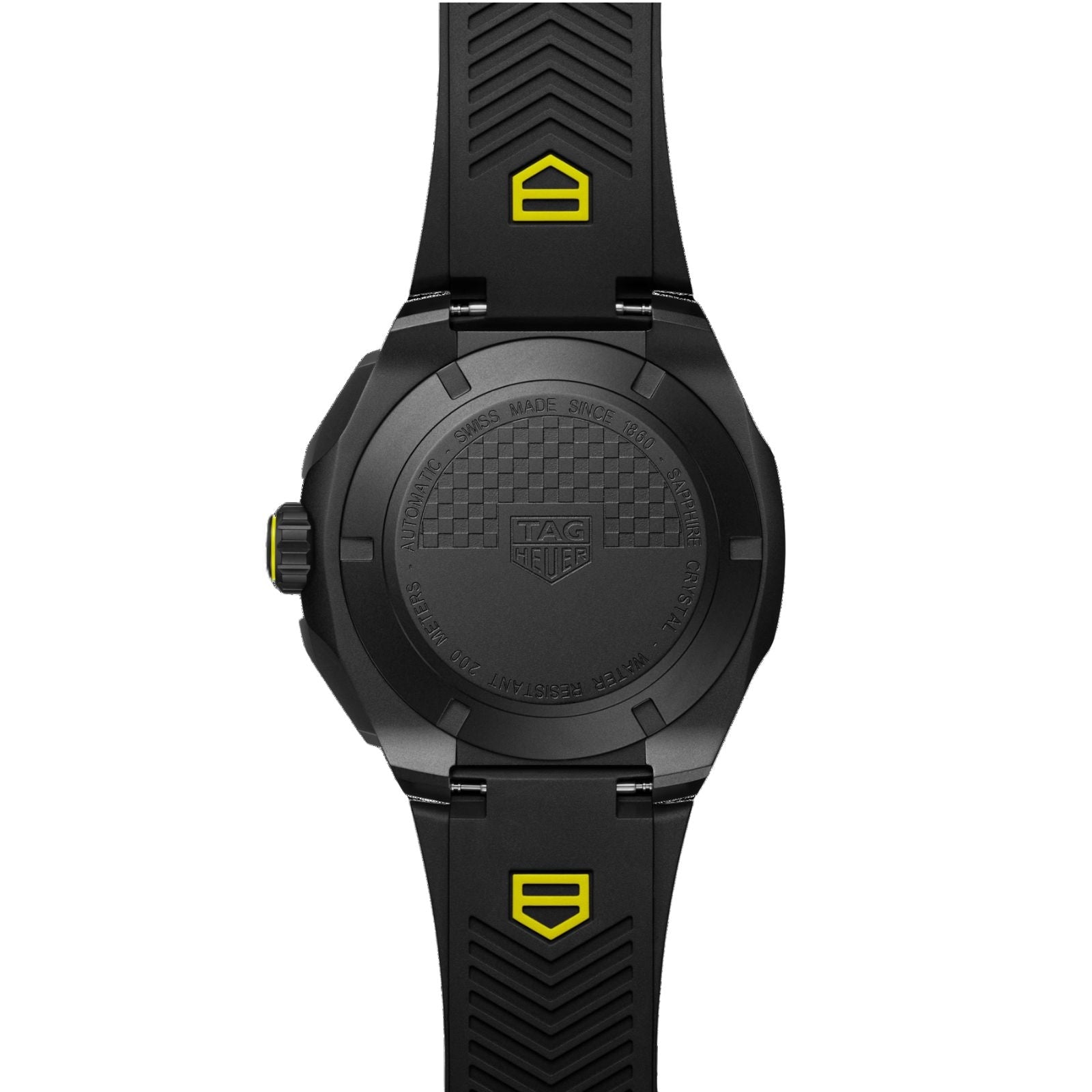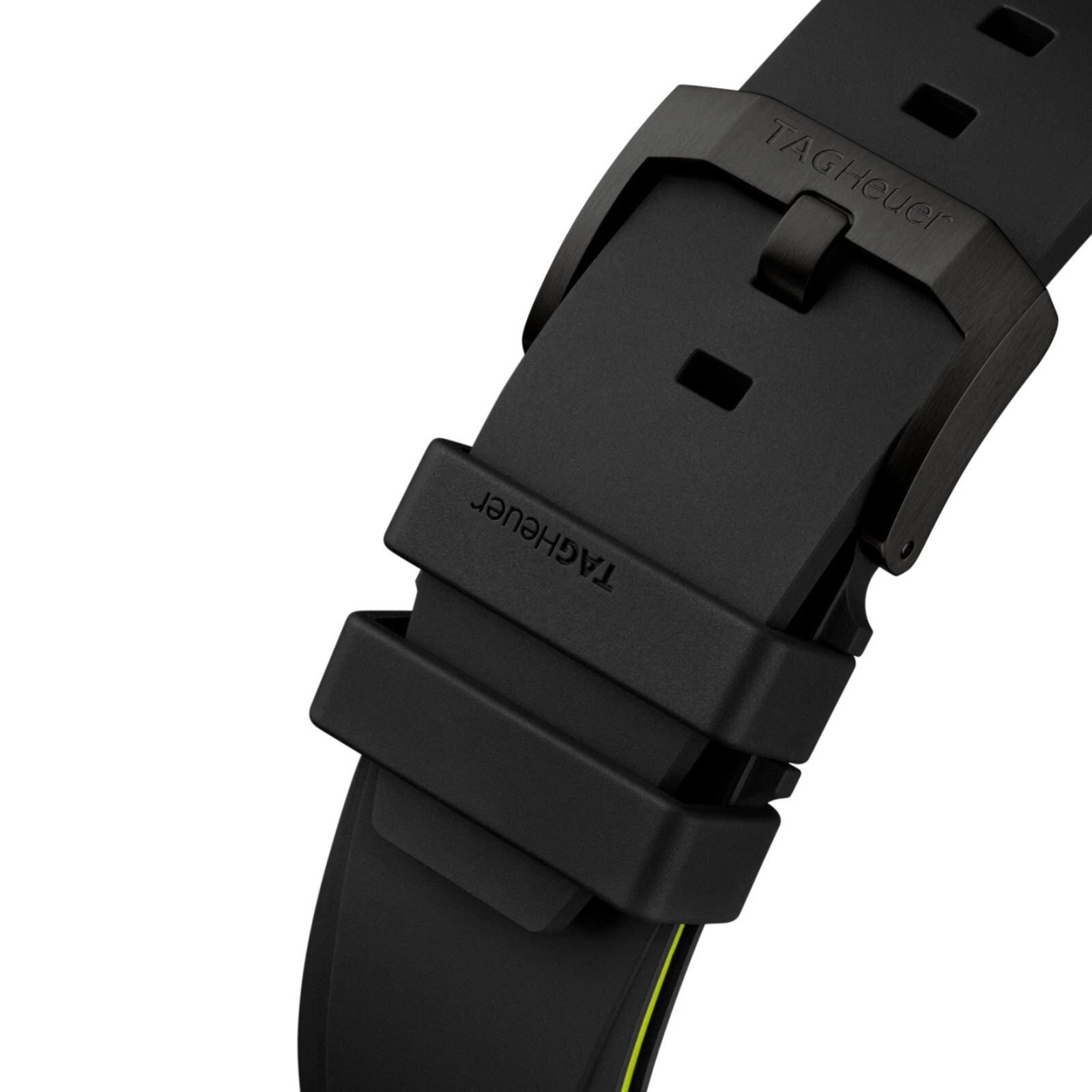 The TAG Heuer Formula 1 Chronograph introduces a bold new colour scheme in 44 mm. Featuring lime accents and a dynamic design, this timepiece is built for the modern racer who values precision and style. The black opalin dial is encircled by a lime lacquered track, giving the watch a fresh, modern edge. Luminescent hands and indexes ensure readability by day and night, while the tachymeter bezel highlights the watch’s racing roots. Crafted from Grade 2 titanium coated with black DLC, the case combines exceptional durability and bold style. Water resistance up to 200 metres ensures versatility, while the bi-coloured rubber strap adds a striking finish. Powered by an automatic movement, this chronograph delivers reliable timekeeping. The sandblasted push buttons and screw-down crown reinforce the watch's robust, racing-inspired design.