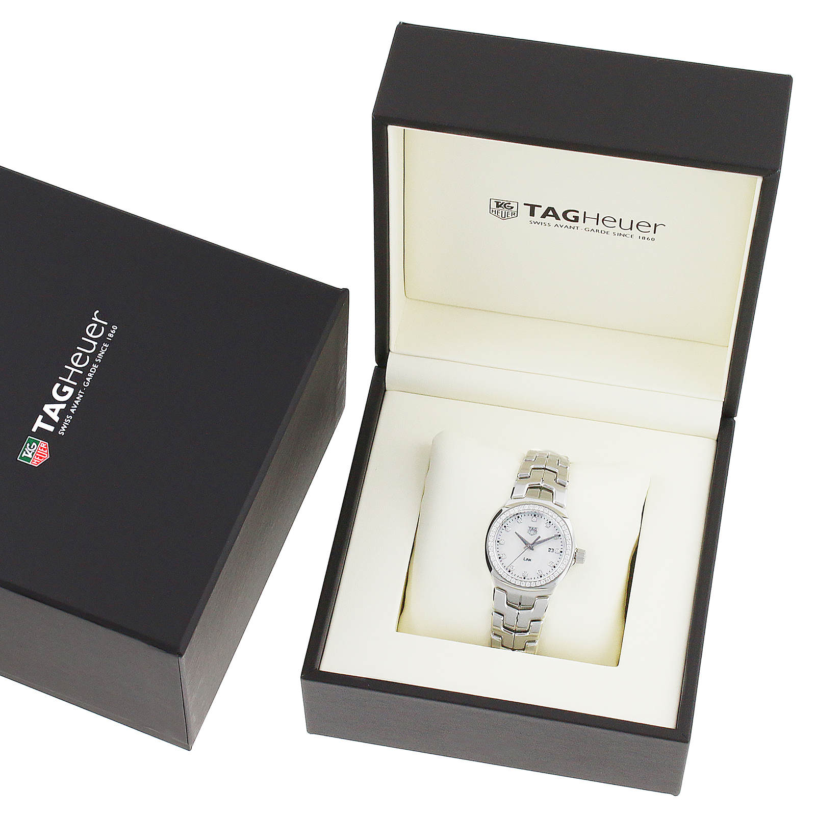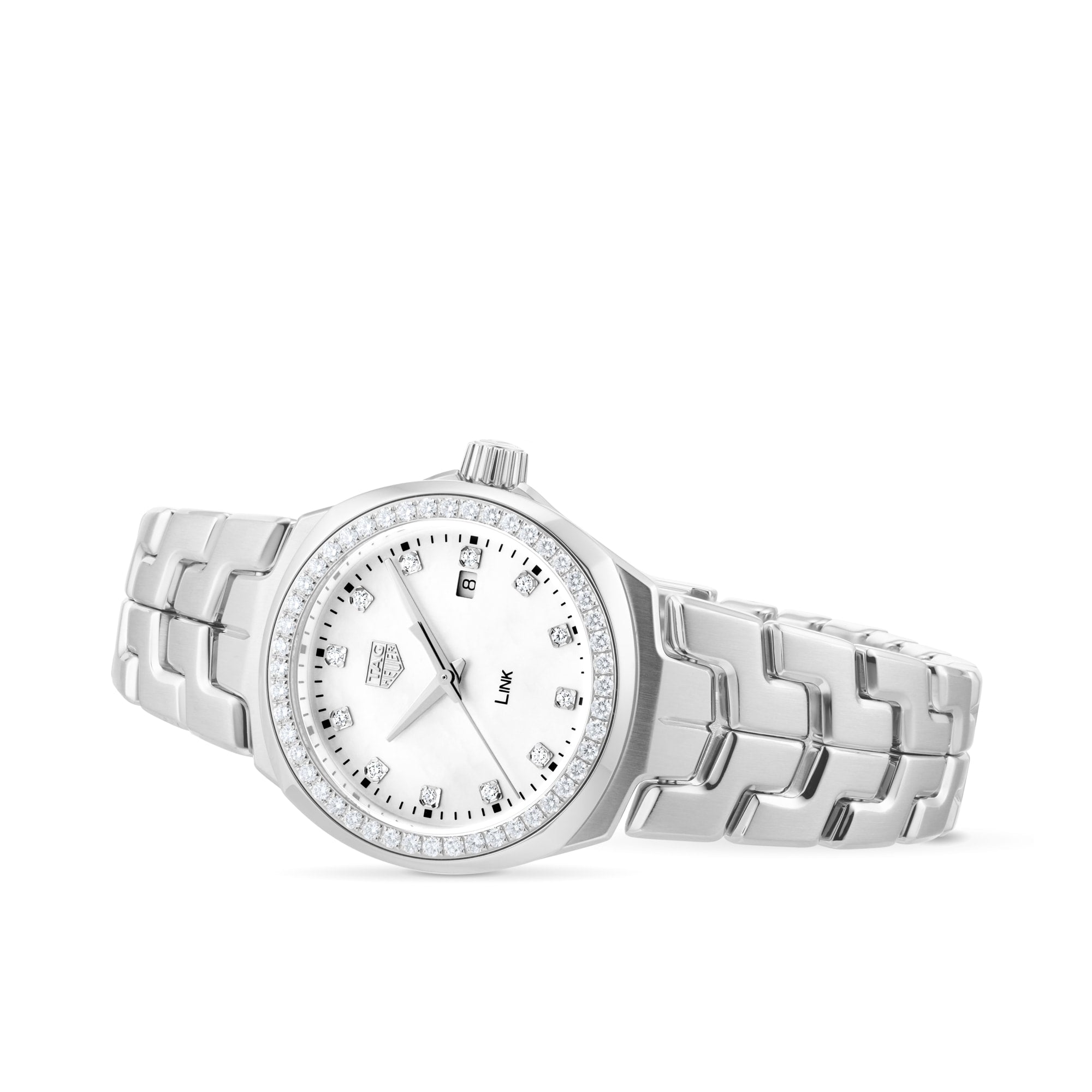 Link - an icon of sport and elegance Thinner, flatter, and more contemporary Secured with an iconic S-shaped bracelet Feminine white mother-of-pearl dial with glistening diamond hour markers Presented in a hand-finished 32mm steel case with a diamond-set bezel AN ICON OF SPORT AND ELEGANCE Streamlined to its purest form, the TAG Heuer Link collection embraces motion, purity, curve, and precision, combining comfort and avant-garde aesthetics. The only collection whose design started with its bracelet, the models float weightlessly on the wrist with an integrates S-shaped creation that combines fluidity with a strong aesthetic. A STREAMLINED SILHOUETTE Presented in a 32mm hand-finished steel case, this beautiful timepiece fastens with a distinct S-shaped bracelet. Framed by a glistening diamond-set bezel, the white mother-of-pearl dial is distinctly feminine, with 12 glistening diamond hour markers reflecting the light from every angle. A reliable quartz movement ensures powerful precision, while water resistance to 10 bar (100 metres) enhances performance.