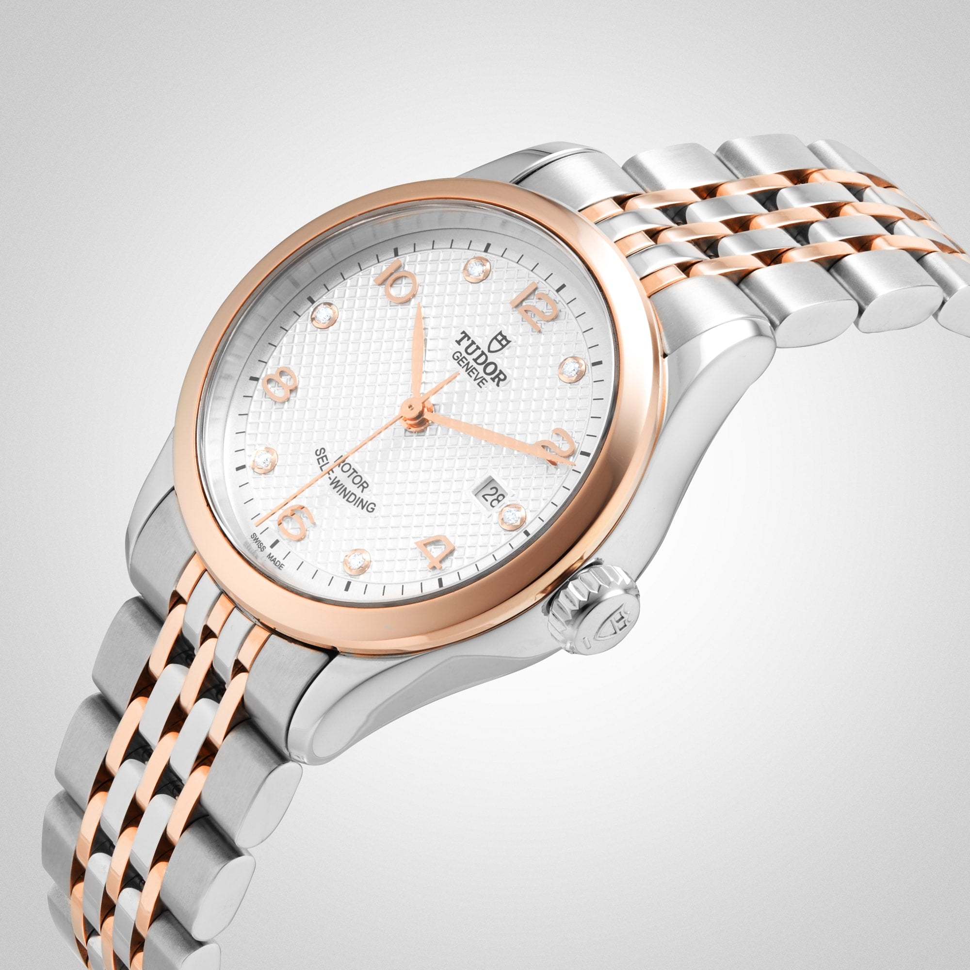 Combining traditional horology aesthetics with modern, high-performance craftmanship, the 1926 collection from Tudor is highly refined and pays tribute to the brand’s early history in a timeless and elegant manner. Set within a 28mm steel case with a polished finish, the striking silver domed dial with embossed decoration is organized with a date display window at 3 o’clock, gold hands and Arabic numerals and 6 sparkling diamond hour markers. Protected by a sapphire crystal glass, the dial is framed by a smooth rose gold bezel and is presented on a steel and rose gold bracelet with a folding clasp and safety catch. Powered by a self- winding mechanical caliber 2671, this performance led time instrument is water resistant up to 100 meters, delivering outstanding timekeeping no matter the occasion. Explore the full Tudor collection.