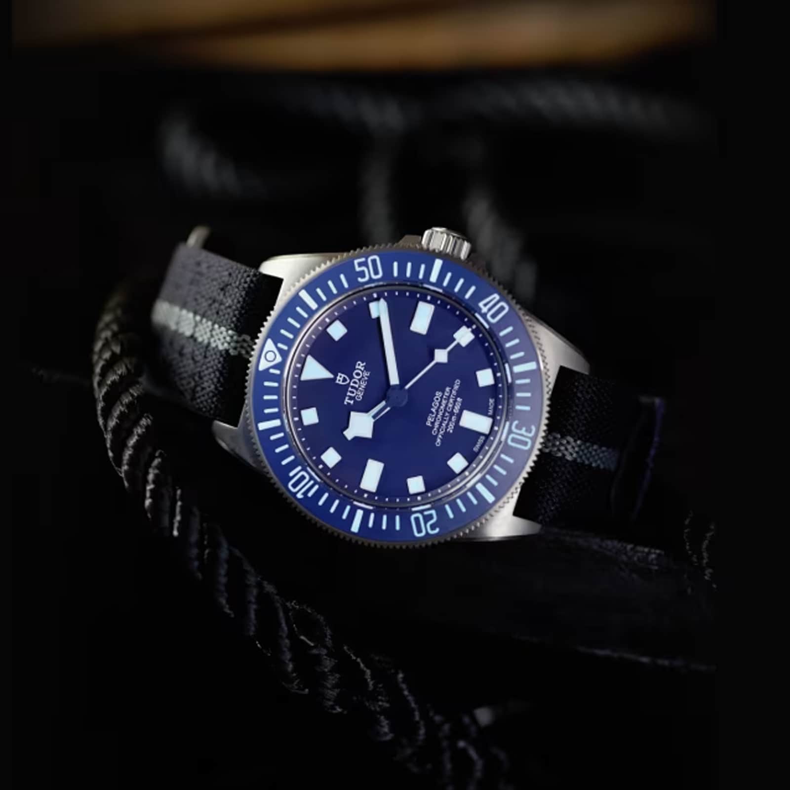 Developed in conjunction with the French Navy's combat swimmers, the Pelagos FXD model is based on a set of specifications that are as precise as they are demanding. For this reason, it includes many functional features that are new to TUDOR, such as its fixed strap bars that are machined into the main body of the 42 mm titanium case for increased robustness and reliability. Five-year Guarantee Five-year transferable guarantee with no registration or periodic maintenance checks required Case Titanium case, 42mm in diameter, 12.75mm thick, 52mm from lug to lug, satin-brushed finish Fixed bracelet bars Steel case back Lugs: 22mm lug width Case thickness: 12.8mm Movement Manufacture Calibre MT5602 (COSC) Self-winding mechanical movement with bidirectional rotor system Power Reserve Power reserve of approximately 70 hours Winding Crown Titanium crown, adorned with the TUDOR shield in relief Waterproofness Waterproof to 200m (660 ft) Bezel Bidirectional rotating bezel in titanium with ceramic disc, 60-minute retrograde graduation for navigation by successive stages Dial Navy blue Crystal Sapphire crystal Bracelet Navy blue fabric strap with grey central thread, equipped with a self-gripping fastening system Complimentary navy blue rubber strap with woven motif and titanium buckle, included in the box