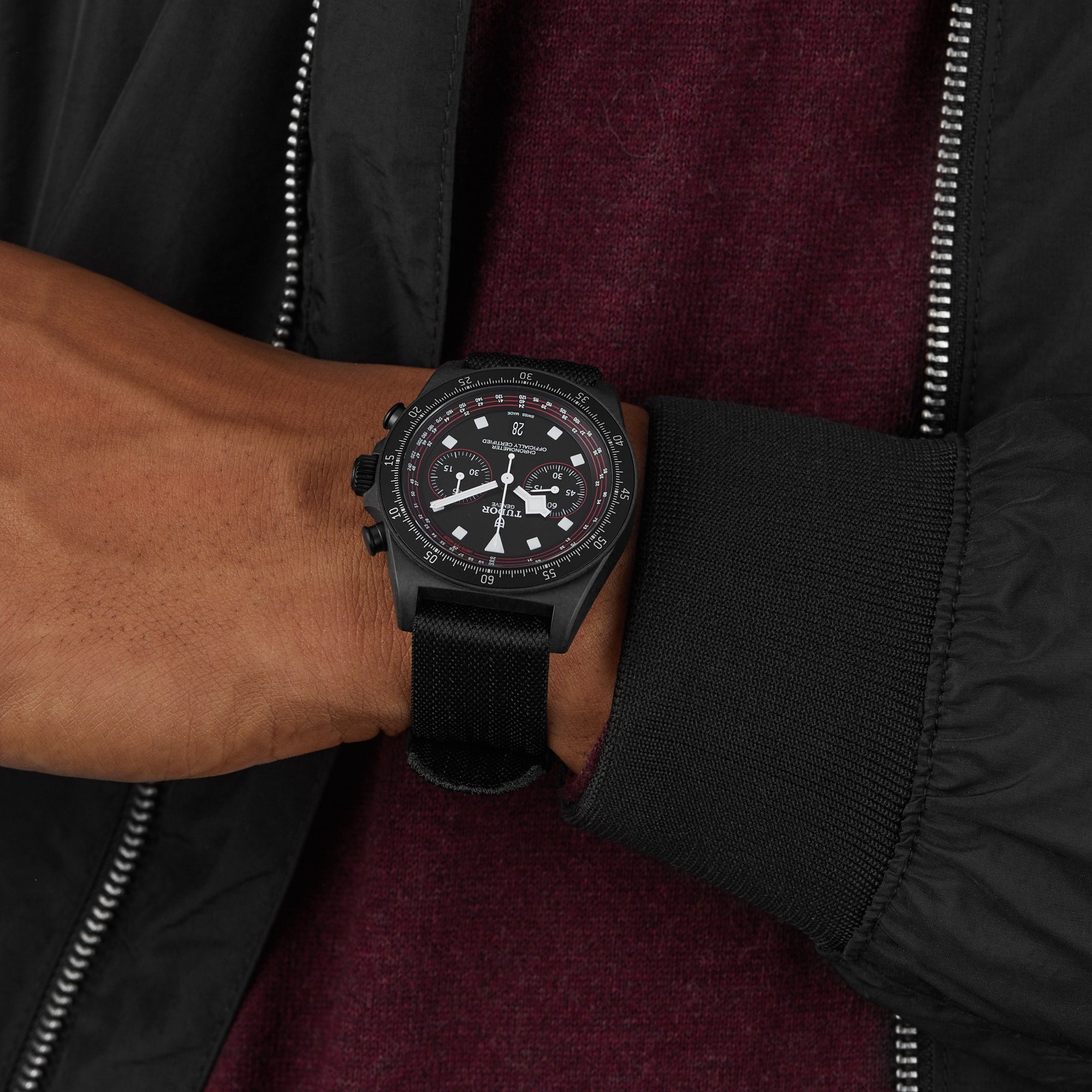 Specifically engineered for riders of the TUDOR Pro Cycling Team, the Pelagos FXD Chrono “Cycling Edition” is a cycling-themed chronograph made with minimal weight and functionality in mind. Featuring a carbon composite case fitted with a high-performance Manufacture Calibre and cycling-specific tachymeter scale, this watch stands up to the extreme demands of the sport while being easy for the rider to operate.