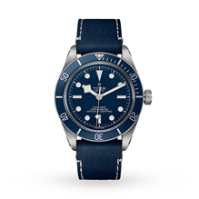 The Black Bay celebrates 60 years of diving watches with extraordinary heritage. The iconic model inherits the general lines, as well as the domed dial and crystal from the first Tudor diving watches. It borrows the characteristic angular hands, known as snowflake, from the watches delivered in large quantities to the French National Navy in the 1970s. Offering a sporty yet sophisticated look, this Tudor Black Bay Watch showcases a bold blue dial and unidirectional rotatable bezel in steel with 60- minute graduated disc in matt blue anodised aluminium and silver gilded markings and numerals. Presented within a 39mm stainless steel case, the dial is powered by a self-winding mechanical movement with bidirectional rotor system. This watch is also water resistant to 200 metres. Features include Reference number: 79030B Case: 39mm 316L steel case with polished and satin finish Thickness: 11.9mm Bezel: Unidirectional rotatable bezel in steel with 60-minute graduated disc Crown: Steel screw-down winding crown Dial: Blue, domed Crystal: Domed sapphire crystal Water Resistance: 200 metres (660 ft) Bracelet: Brown leather strap Calibre: Manufacture Calibre MT5402 (COSC) Functions: Hours, minutes, seconds (Stop-seconds for precise time setting) Power Reserve: Approx. 70 hours Winding: Automatic Jewels: 27 Frequency: 28,800 beats/hour (4Hz) Discover the full Tudor collection.