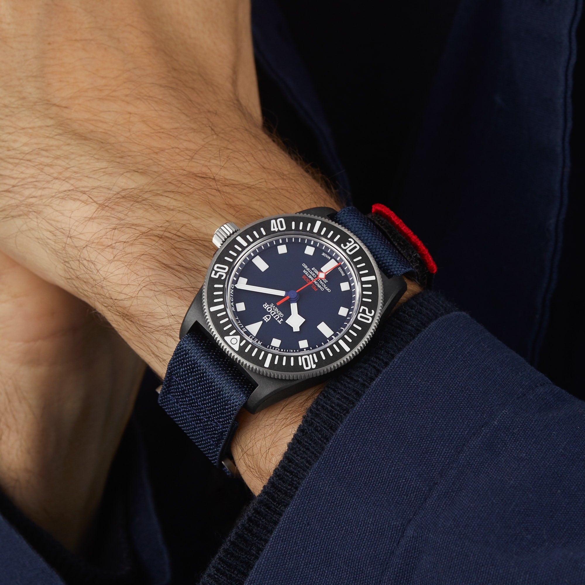 The Pelagos FXD model, where FXD refers to the extra robust fixed strap bars of the case, was developed in conjunction with the French Navy's combat swimmers. Waterproof to 200 m (660 ft), it was designed for underwater navigation and is optimized for professional use.