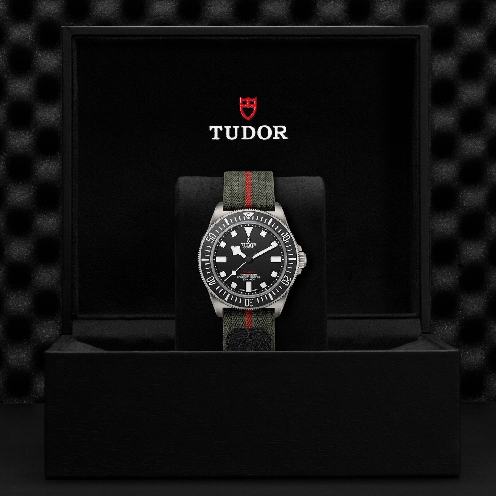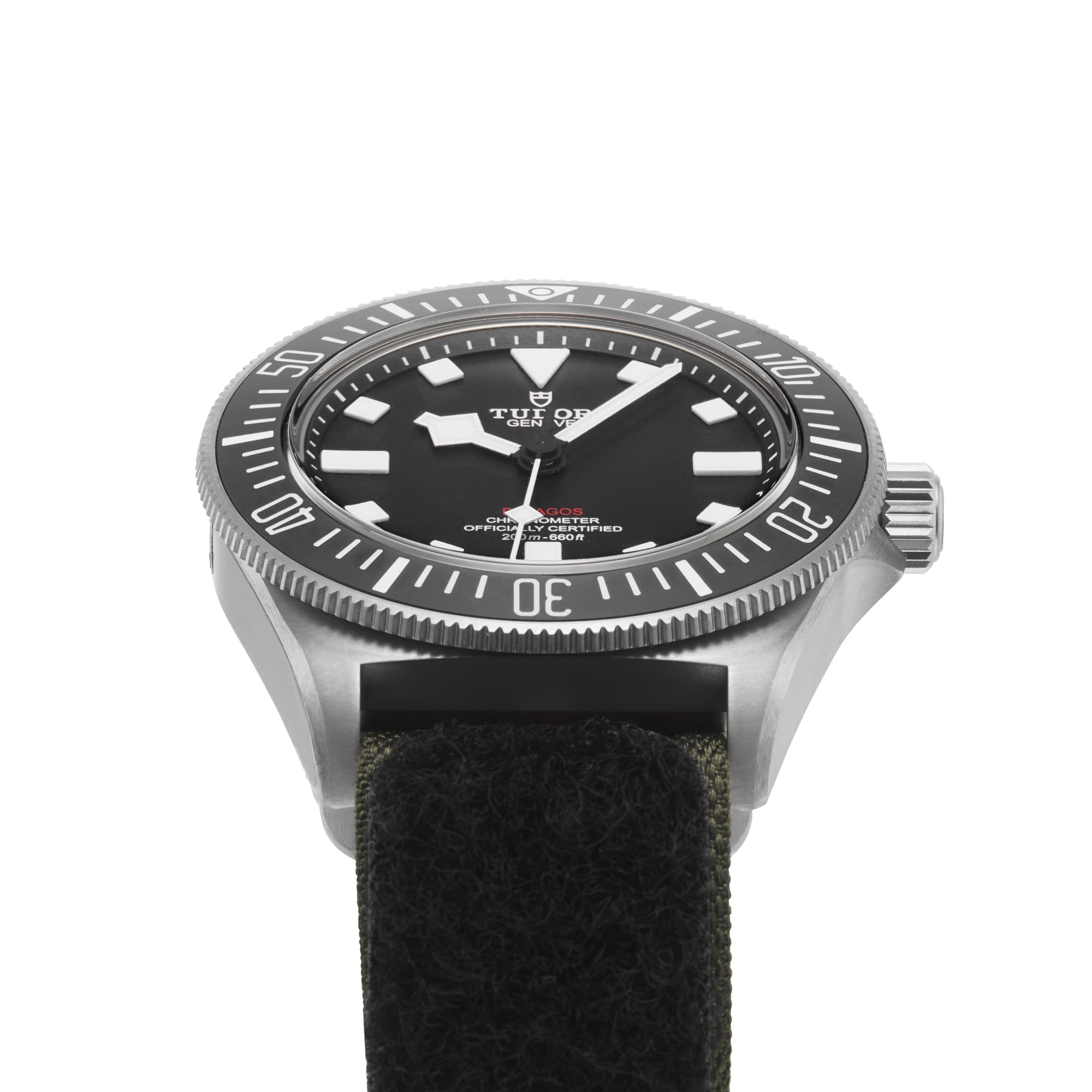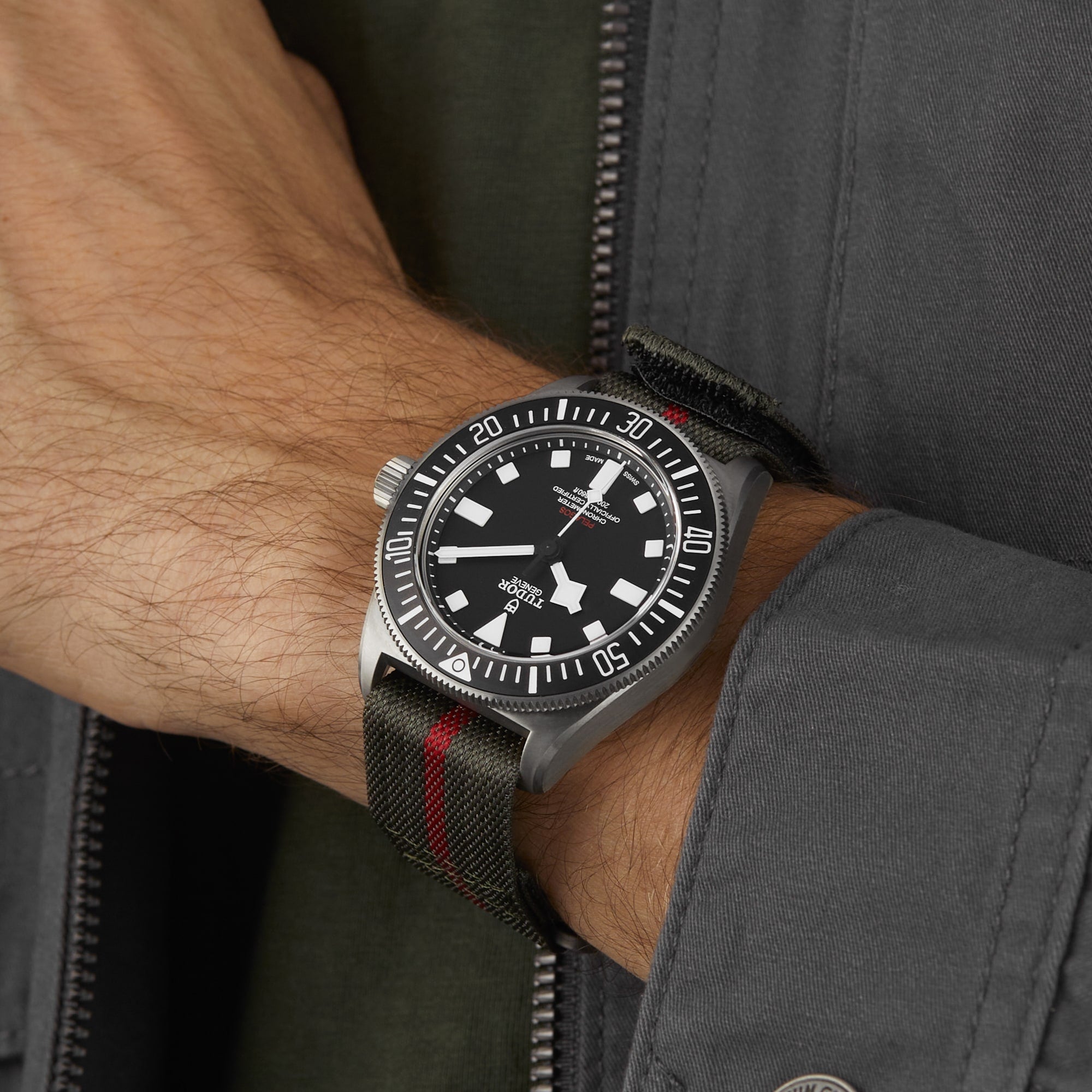 The new Pelagos FXD pays tribute to decades of TUDOR watches on the wrists of US Navy divers. Complete with fixed strap bars, a titanium case, a high-performance Manufacture Calibre and a unidirectional elapsed-time rotating bezel, it comes as the ultimate modern “Milsub”. As early as the mid ‘50s, TUDOR diving watches were being tested and evaluated by a number of outfits inside the US Navy, and by 1958 they were officially adopted by the Navy and purchased for the purpose of issuing them to divers operating in various units. This Pelagos FXD model is the spiritual successor of those watches. The nomenclature hints at the background of the watch, with FXD referring to the incredibly robust FiXeD strap bars of the case. The model represents a modern, high-performance and robust take on the famed “Milsub” (short for Military Submariner) of yesteryear. Visually, it’s most in line with a late ‘60s- era TUDOR Oyster Prince Submariner reference 7016; it incorporates elements from the US military specifications for diving watches, such as fixed spring bars, as well as details inspired by other generations of issued TUDORs, like pointed crown-guards typically found on early TUDOR Submariners. CASE Titanium case, 42mm in diameter, 12.75mm thick, 52mm from lug to lug, satin-brushed finish fixed strap bars, steel case back BEZEL Unidirectional rotating bezel in titanium with ceramic disc, 60-minute graduation WINDING CROWN Titanium crown, adorned with the TUDOR shield in relief DIAL Matt black CRYSTAL Sapphire crystal WATERPROOFNESS Waterproof to 200m (660 ft) STRAPS 22mm fabric strap with self-gripping fastening system, forest green with red central thread, additional black rubber strap with woven motif and titanium pin buckle, included in the box MOVEMENT Manufacture Calibre MT5602 Self-winding mechanical movement with bidirectional rotor system POWER RESERVE Approximately 70 hours PRECISION Swiss chronometer officially certified by COSC (Swiss Official Chronometer Testing Institute) FUNCTIONS Centre hour, minute and seconds hands Stop-seconds for precise time setting OSCILLATOR Variable inertia balance, micro-adjustment by screw Non-magnetic silicon balance spring Frequency: 28,800 beats/hour (4 Hz) TOTAL DIAMETER 31.8mm THICKNESS 6.5mm JEWELS 25 jewels