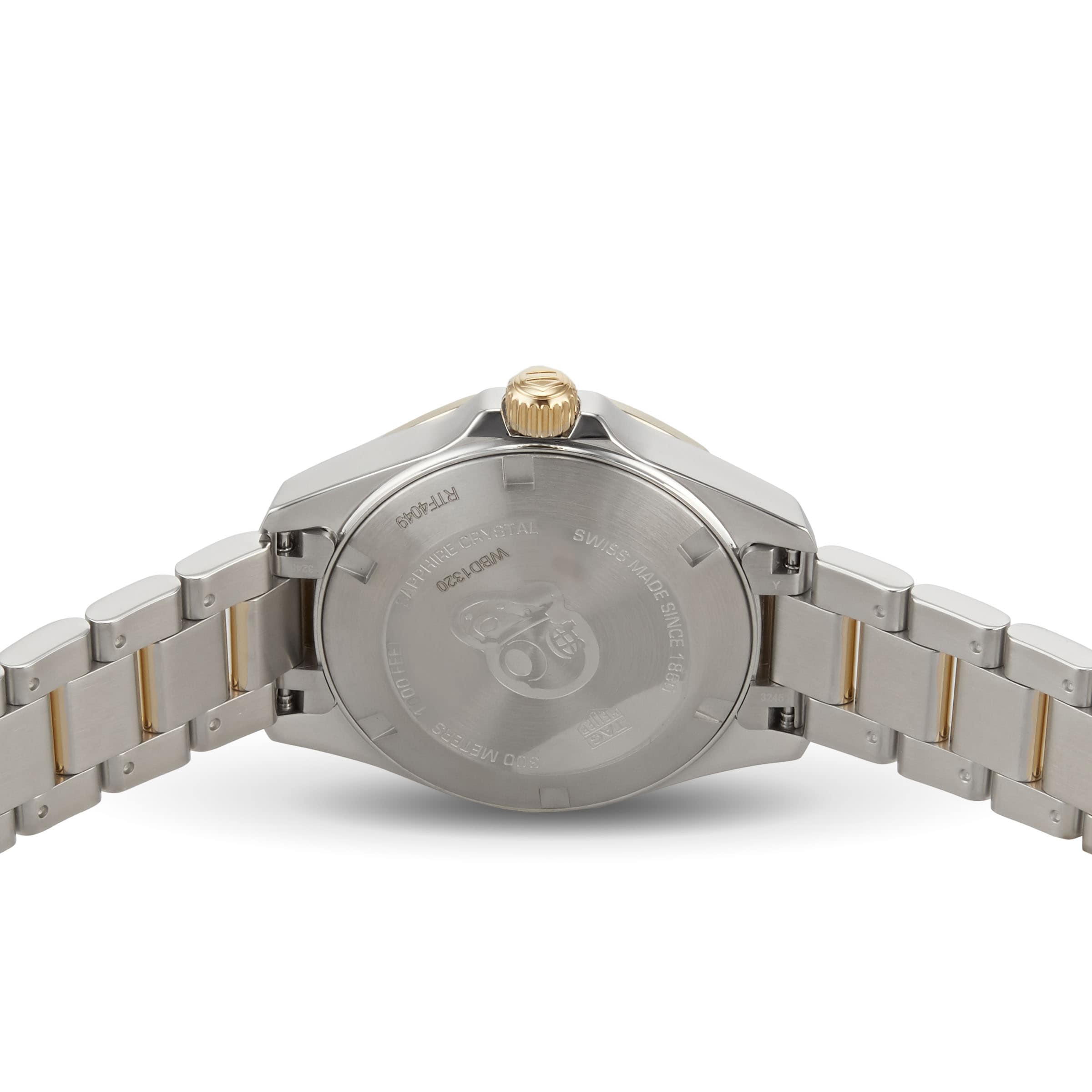 Aquaracer – pushing limits in search of greater performance Refined elegance with a sporting pedigree 32mm stainless steel and 18K 2N yellow gold plated case with a gold-plated bezel Ethereal white mother-of-pearl dial with gold-plated hands and indexes Powered by precise Quartz movement ASSERTIVE DESIGN Re-launched in 2021, the Aquaracer collection has re-written sports watch design and performance codes to take wearers beyond the edge as they push their limits in search of ever greater performance. This Aquaracer 300 32mm model updates the collection’s sporting pedigree with elegant touches, including a stainless steel and 18K 2N gold-plated case, and a refined white mother-of-pearl dial. PERFORMANCE, PERSONALITY, AND GLAMOUR Crafted with beautiful proportions, this luxurious model combines 18K 2N gold with ethereal, white mother-of-pearl. Powered by a reliable Quartz movement, the mother-of- pearl dial presents gold-plated hands and indexes with a luminescent coating for optimum visibility, and a date display at 3 o’clock. Water resistance to 30 bar (300 metres) and an extendible diving bracelet ensure that this robust timepiece is as functional as it is visually striking. A gold-plated crown sits at 3 o’clock, while the caseback is engraved with the Aquaracer diver emblem.